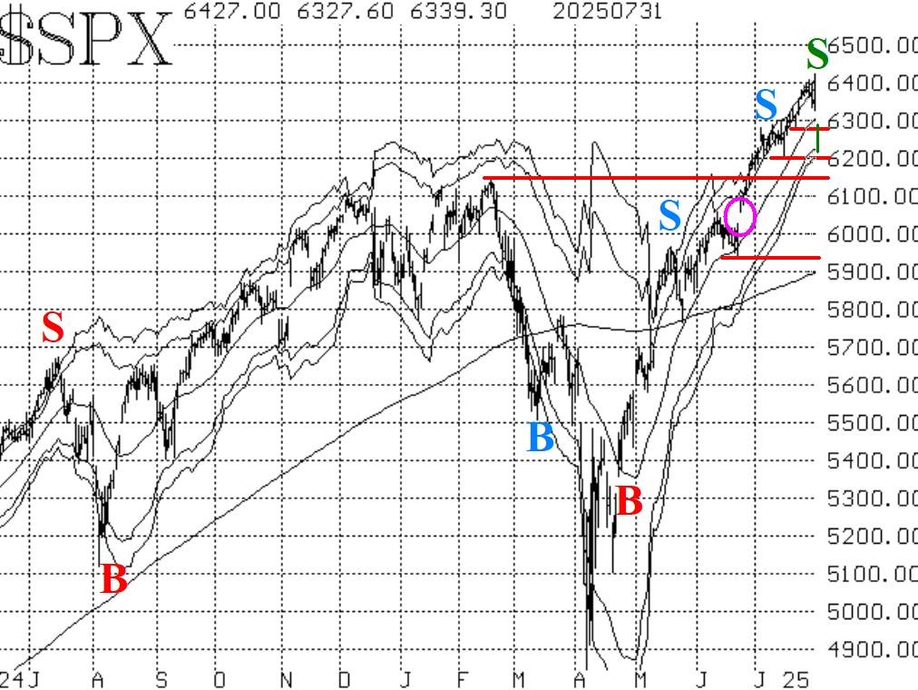 The buildup of overbought conditions has manifested itself in new confirmed sell signals. However, the $SPX chart is still positive, and will remain so, certainly as long as it's above 6150. A bullish case can theoretically be made for $SPX all the way down to 5920, but at this point, if it were to fall back below the February highs (6150), that would be psychologically damaging for it would mean that the whole breakout in June and July was a false one.
