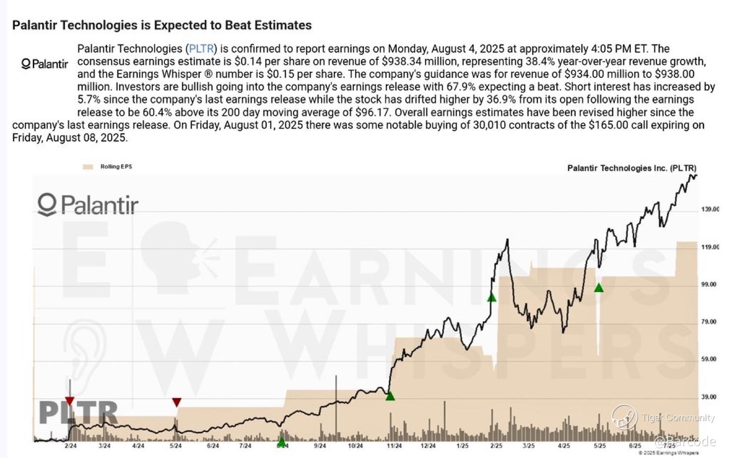 Palantir has guided Q2 revenue between $934Mβ$938M, targeting 38.4% YoY growth at the midpoint. Citi is more bullish, expecting a 2β3 point beat with upside across both government and commercial arms, especially AI-led demand. Whisper EPS is $0.15, consensus $0.14, up from $0.03 a year ago (+366.7%). Management delivered 39% revenue growth in Q1; if they stretch toward $970M+, weβre looking at 43β44% YoY.