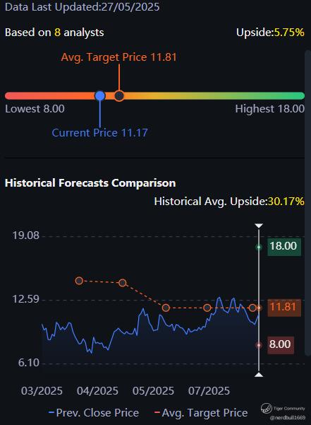 Based on 8 analysts from Tiger Brokers offering 12 month price targets for SoundHound AI, Inc Class A in the last 3 months. The average price target is $11.81 with a high forecast of $18.00 and a low forecast of $8.00. The average price target represents a 5.75% change from the last price of $11.17.