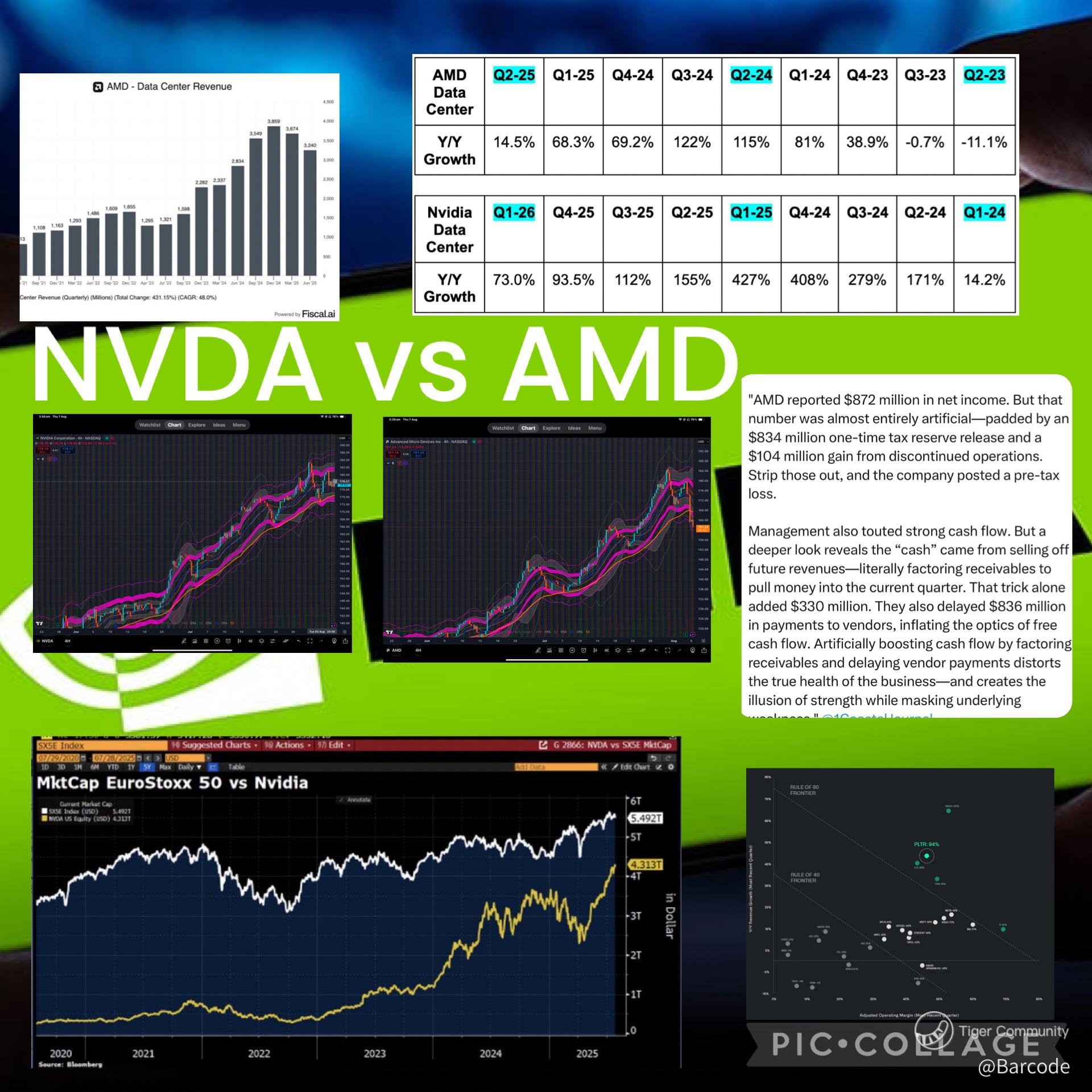 Iβm extremely confident weβre watching a structural bifurcation unfold. AMDβs data center growth is collapsing, credibility is eroding, and the charts have snapped. Meanwhile, Nvidia just printed $30.77B in data center revenue, gained another $72B in free cash flow, and has pulled within $1T of the entire EuroStoxx 50.
