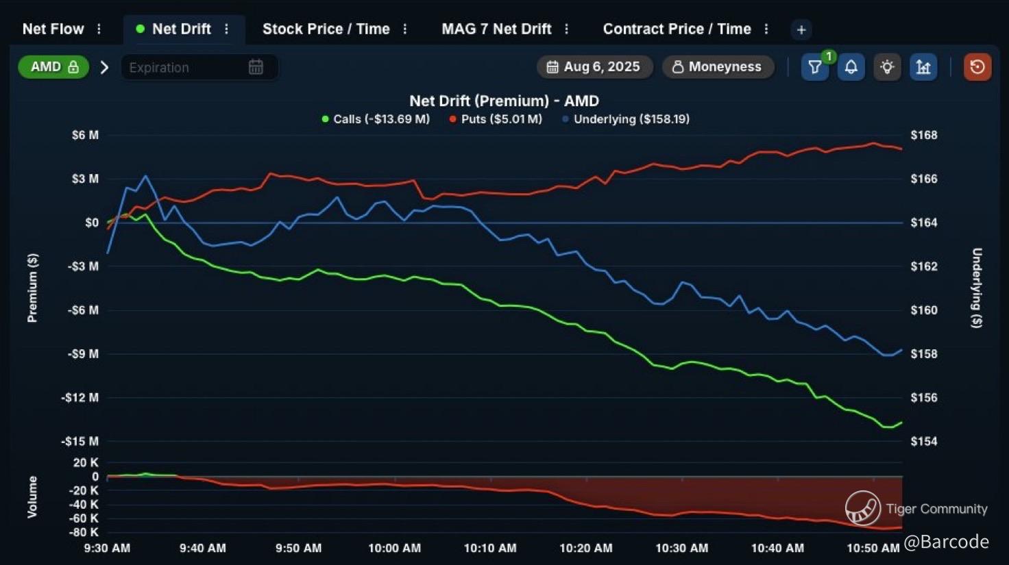 This isn’t just a post-earnings dip; I’m calling it a seismic shift. AMD plunged $14 today, closing down 8.5% to $159.50. Options flow confirmed institutional conviction: $13.69M in calls were sold, $5.01M in puts were bought, all within ≤90 DTE single-leg setups. That’s not a hedge; it’s a tactical evacuation.