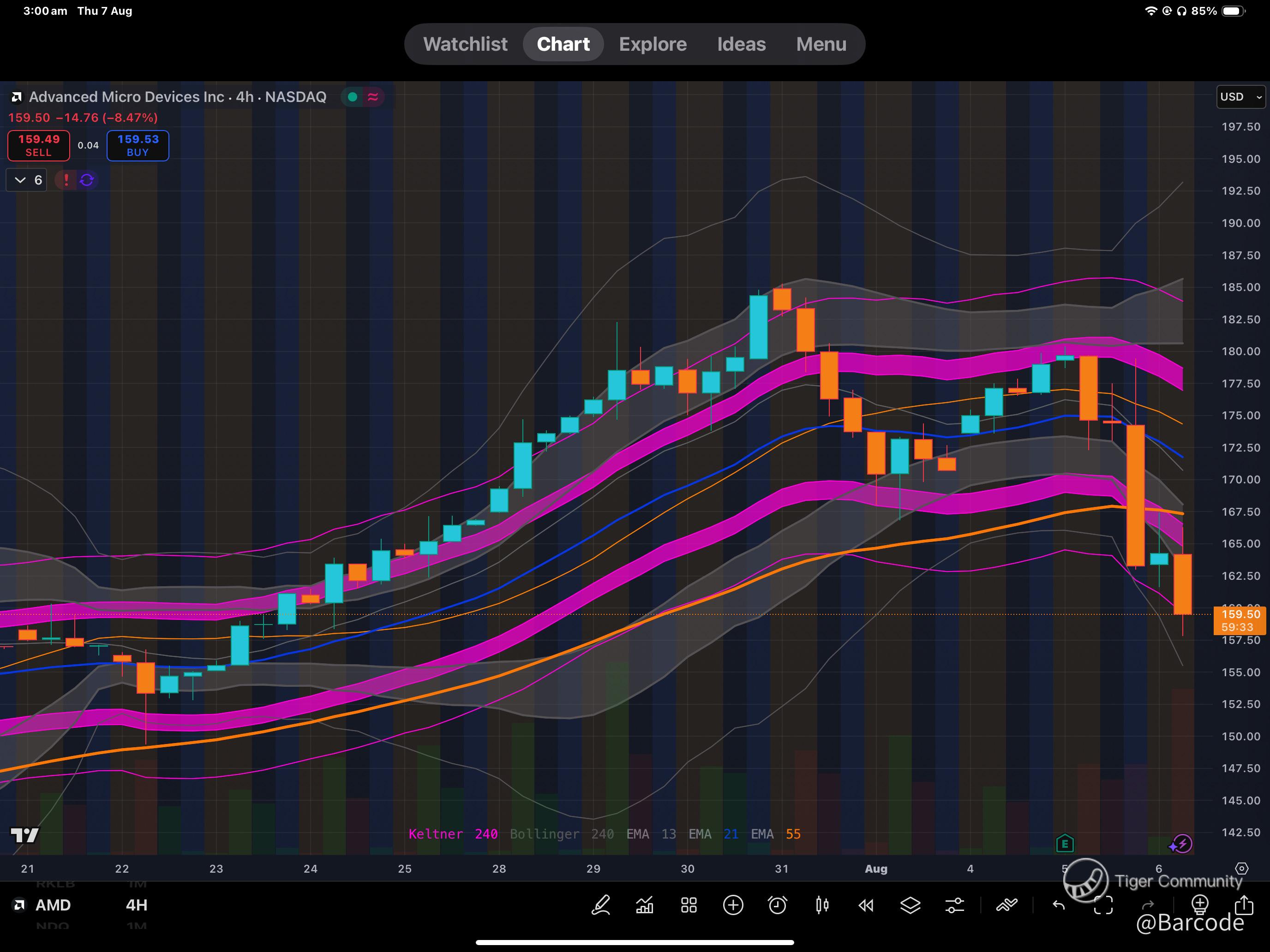 AMD collapsed through critical levels: $177.50, $172.80, $165.60, and finally lost the $160 handle. The move punched through the lower Keltner and Bollinger bands, signaling max volatility. Weekly RSI(6,12,24) shows momentum fatigue at 66.87 / 65.82 / 58.81. MACD(12,26,9) shows a clear bear crossover (DIF = MACD line at 11.91, DEA = signal line at 5.05). Unless $165.60 is reclaimed, the next structural support lies near $118.30 (30-week MA).