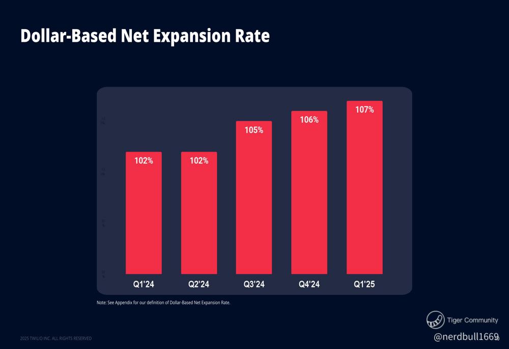 Dollar-Based Net Expansion Rate (DBNER): This metric measures the spending of existing customers and is a key indicator of Twilio's customer health and ability to grow within its client base. A DBNER above 100% is a positive sign, and the market will be looking for a continued increase from the 107% reported in Q1.