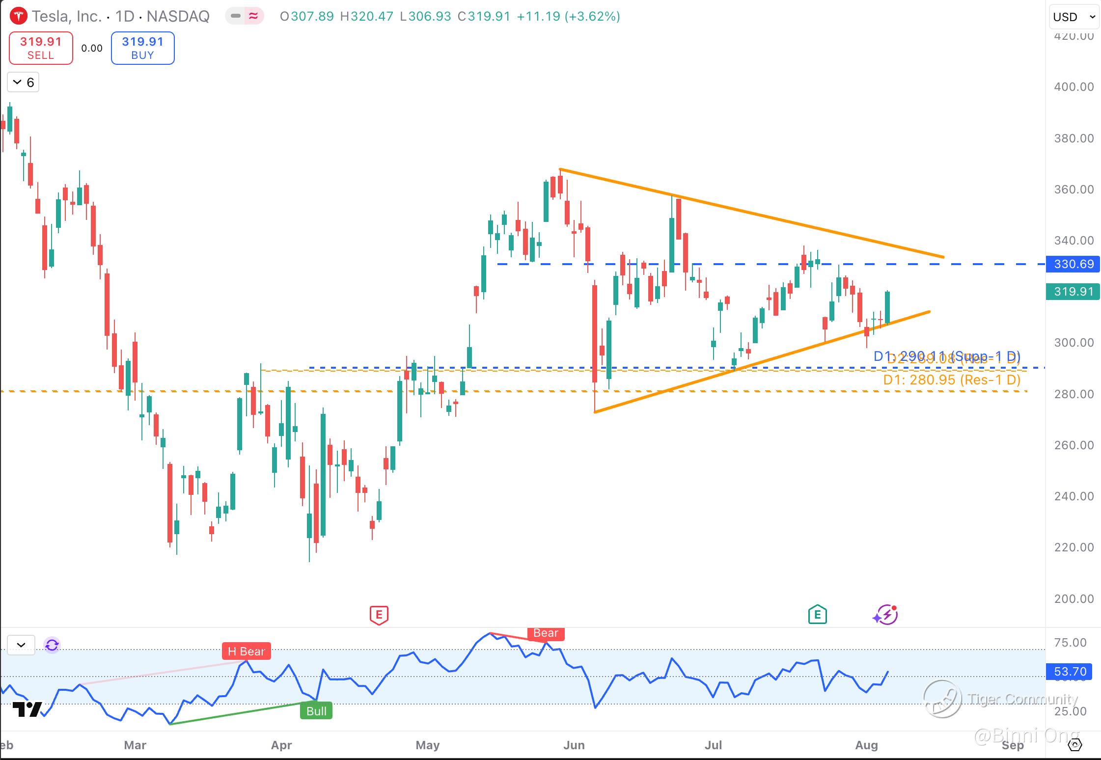 Long DLCs (e.g. $TESLA 3xLongSG261006(TSYW.SI)$ ) could be considered for a bullish outlook, especially if price breaks above $330.50 with conviction or continue to stay above the ascending trendline.