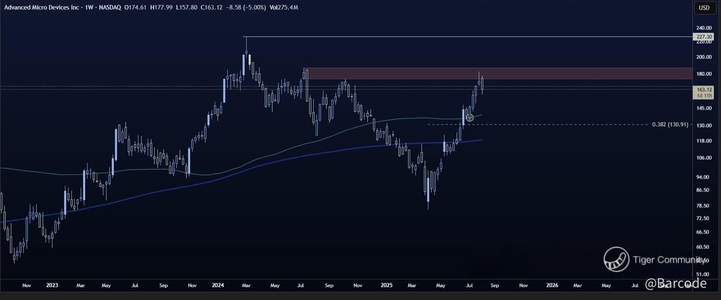 This is a high-volatility, conviction-versus-caution battleground. If AMD clears $180, we could see a fast move toward its former ATH zone near $227.30. But if MI400 hits a production snag like Nvidia’s early GB200 issues, all bets are off.