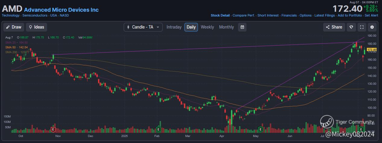 From a chart perspective, AMD’s breakout above resistance near the $160 level is encouraging, but the move remains news-driven rather than trend-driven. Sustaining momentum will require either confirmation of tariff exemptions or a string of earnings beats.