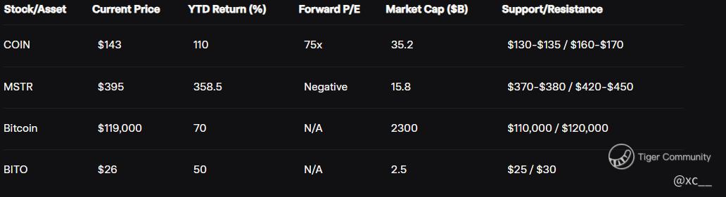 Options Straddle: Buy $143 calls/puts on COIN or $395 calls/puts on MSTR (September expiry) for volatility, targeting 200-300% gains on a 10%+ move.