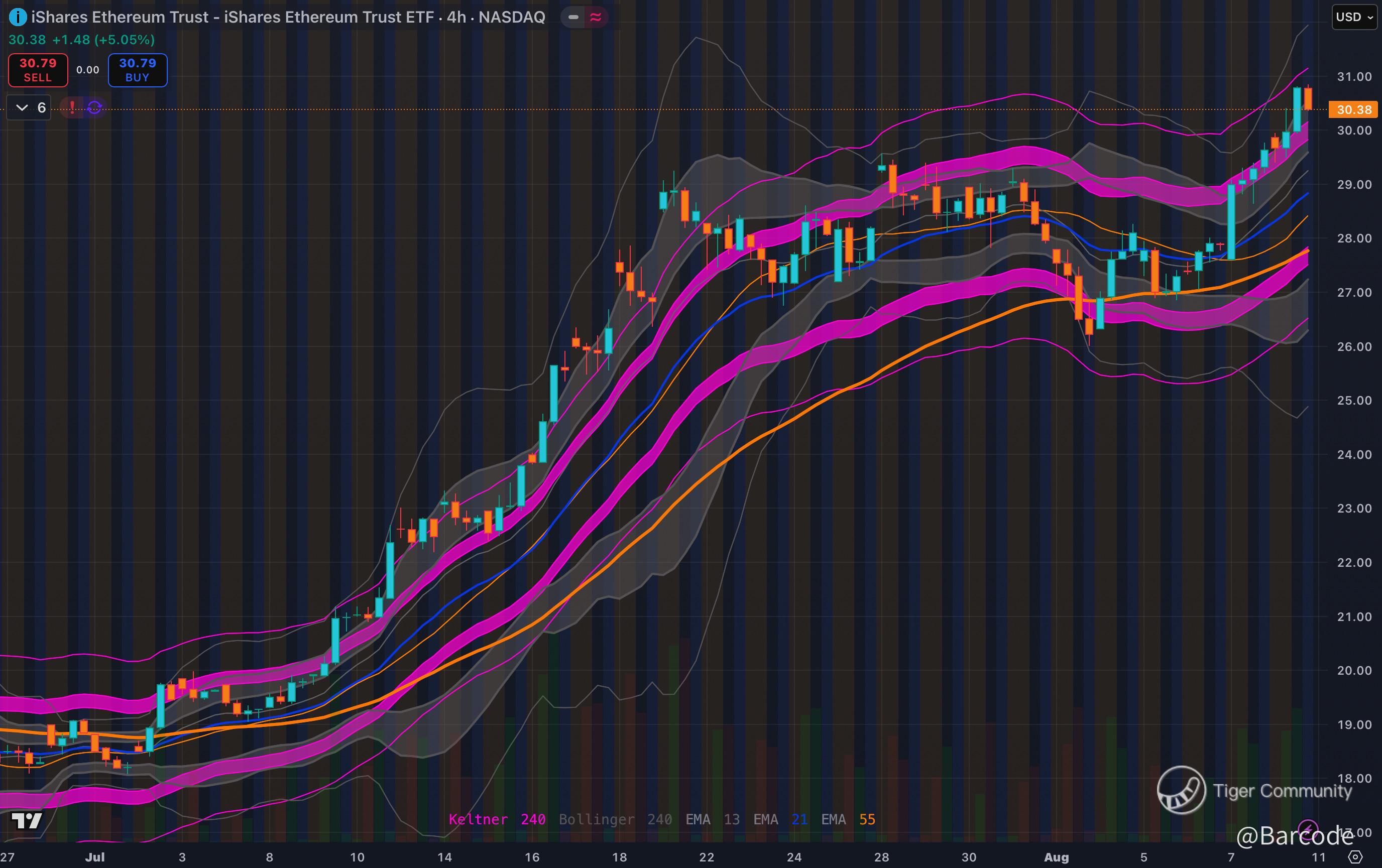 Blackrock’s ETH ETF offers 1:1 exposure to ETH price while enabling covered call strategies for income. Inflows have accelerated over the past month as institutions seek structured exposure. A breakout through $36.20 opens the path to the $39.40 Fib level.