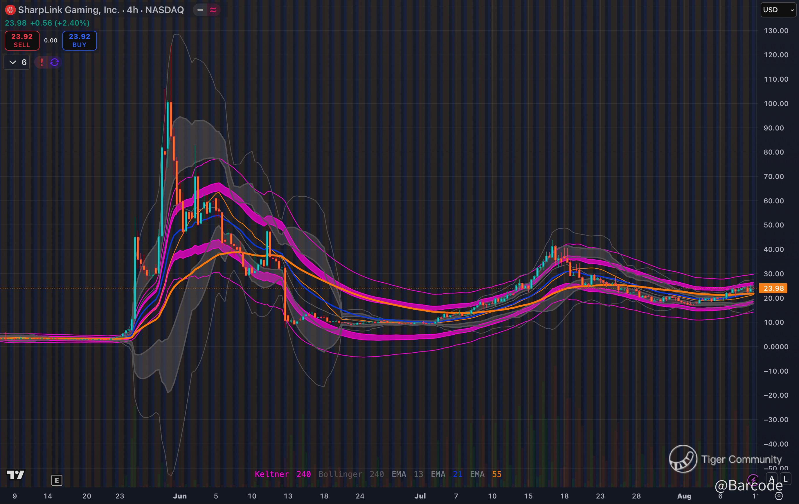 $BMNR has already committed capital to expand its ETH holdings, with price reclaiming $52.66 and breaking above the 0.618 Fib retracement from the July peak. The technical structure shows a Keltner squeeze breakout, early-stage MACD inflection, and volume confirmation; a setup that historically precedes multi-session trend acceleration. $SBET, now at $23.98, is emerging from prolonged compression with a reclaim of the 21 EMA, though BMNR’s liquidity profile and leadership conviction make it my higher-conviction choice.