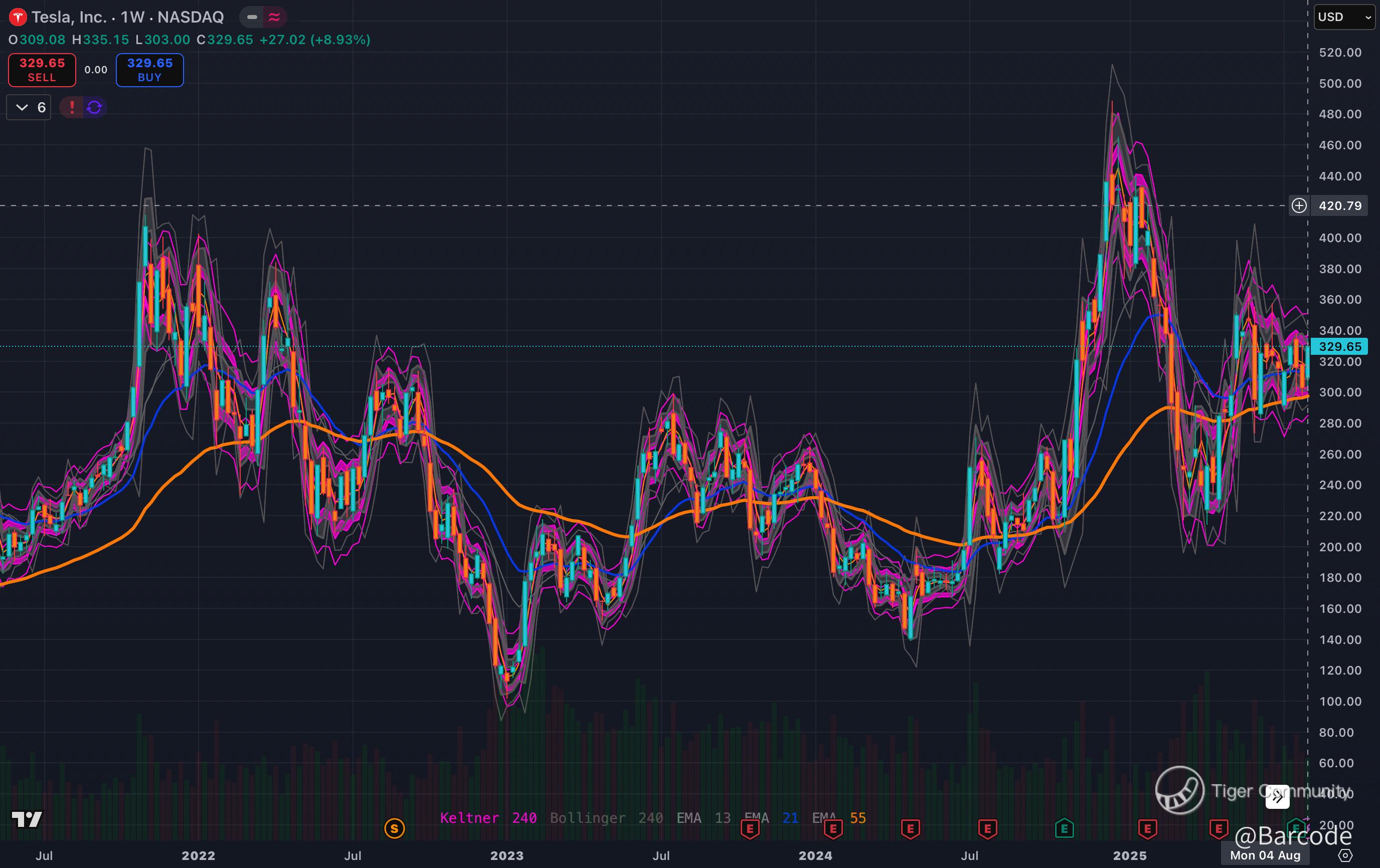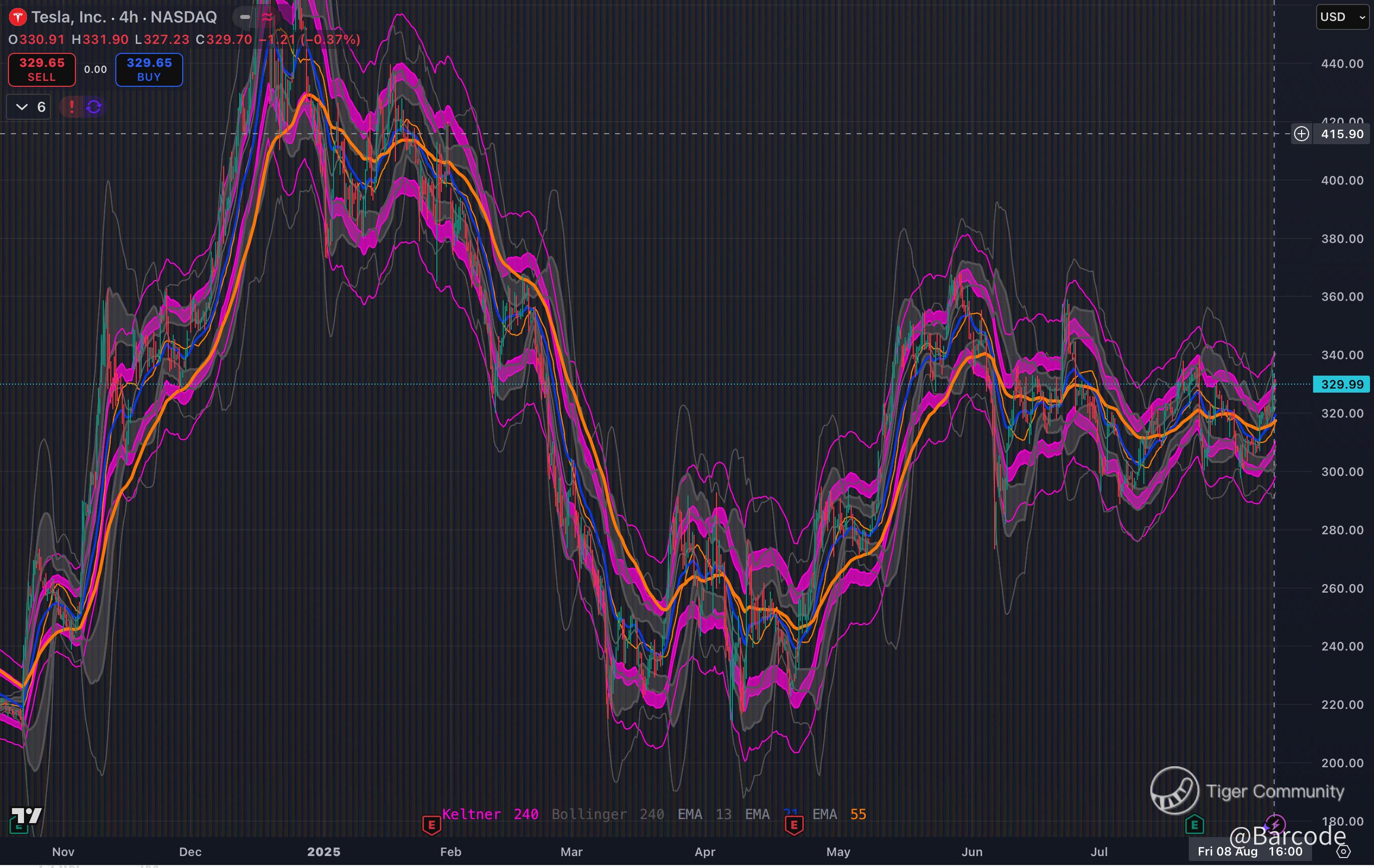 The 4H Keltner/Bollinger overlays now show volatility compression. Tesla’s swings are narrowing, EMAs are converging, and the price is coiling between $325 and $335. Historically, this type of squeeze has preceded outsized directional moves.