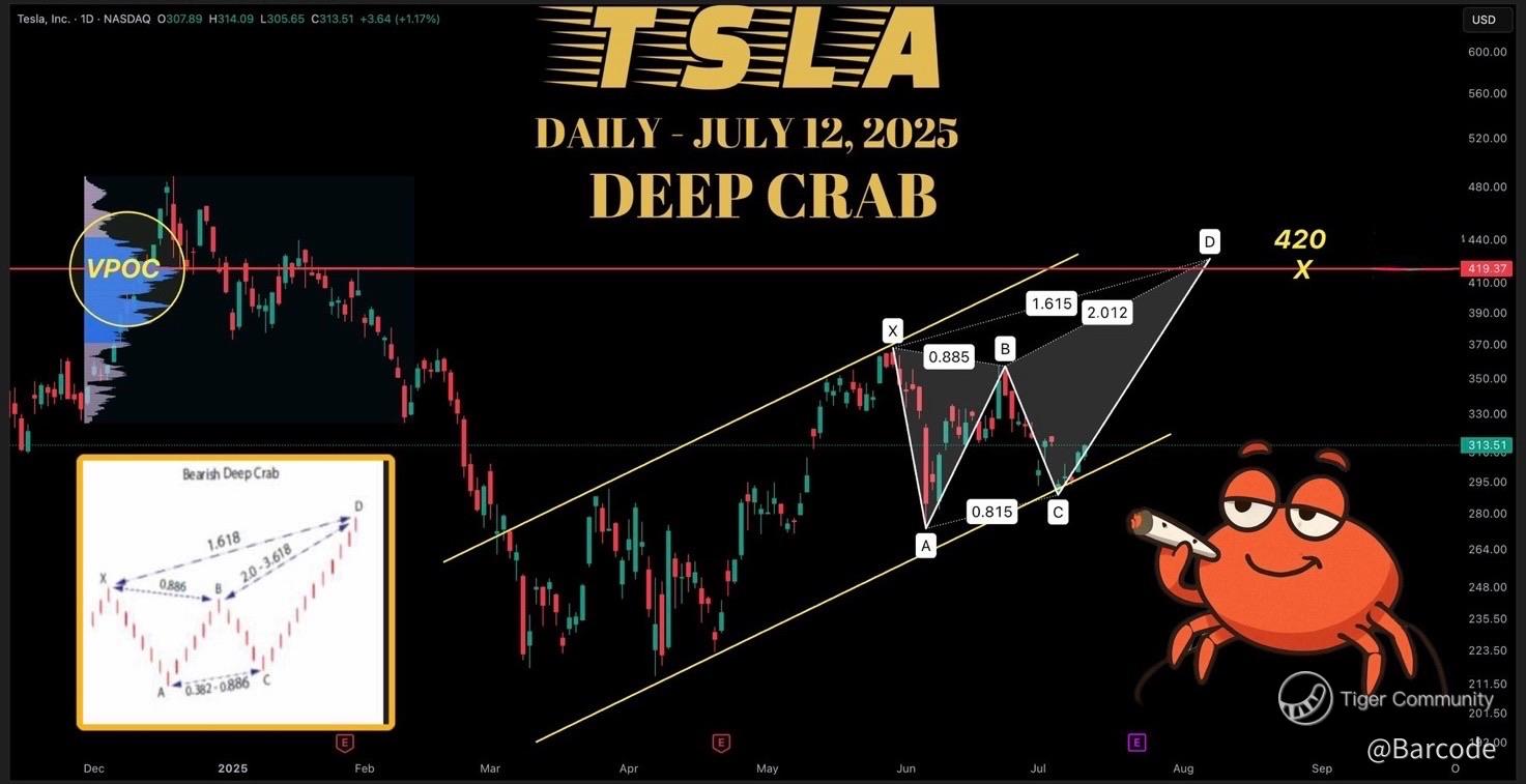 I’m watching Tesla’s price action align across multiple timeframes with an almost textbook harmonic “Deep Crab” formation, eyeing a high-probability confluence near $420. This isn’t just a random resistance; it’s the 2018 meme-level, a volume point of control, and a harmonic completion target, all in one zone.