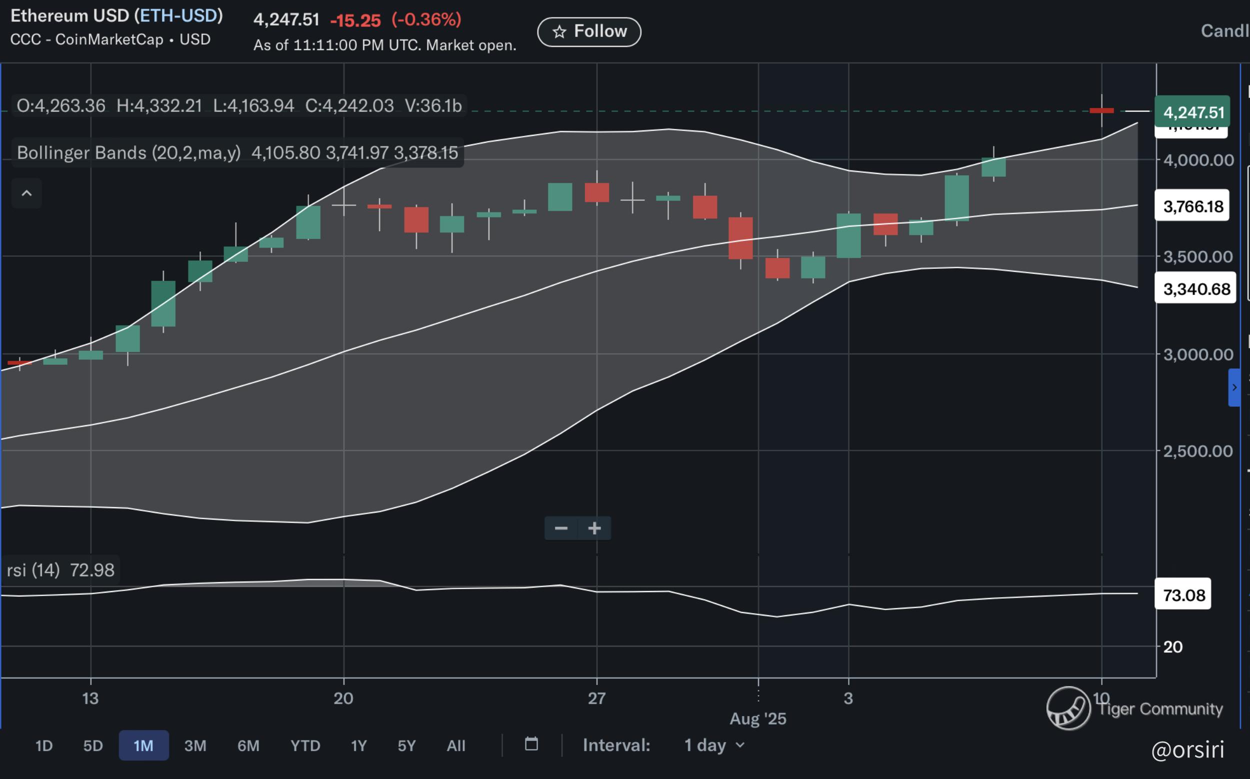 ETH presses upper Bollinger Band as momentum builds toward resistance