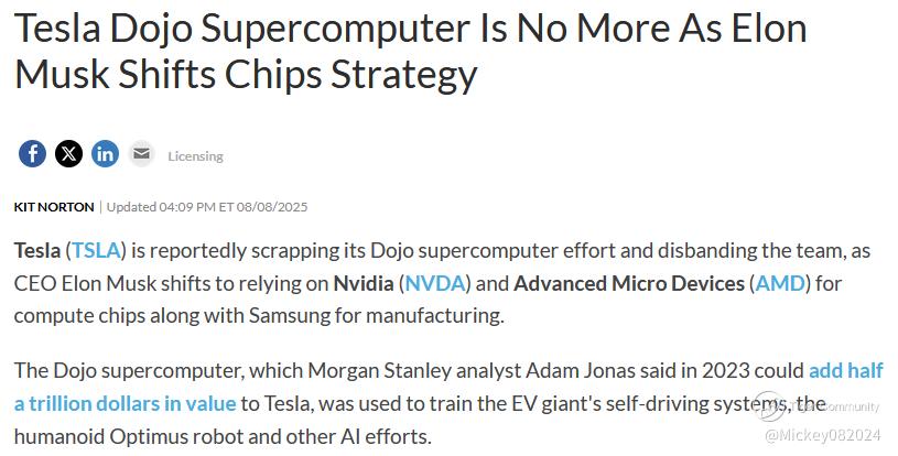 Multiple news outlets reported that Tesla is disbanding the Dojo team and that the project’s lead is departing the company — a sharp reversal for an initiative that had been promoted as a key competitive advantage for training autonomous-driving and robotics models. Management has said the company will concentrate on designing inference chips (AI5/AI6) for deployment in vehicles and robots rather than maintaining a dedicated, large-scale training supercomputer program.