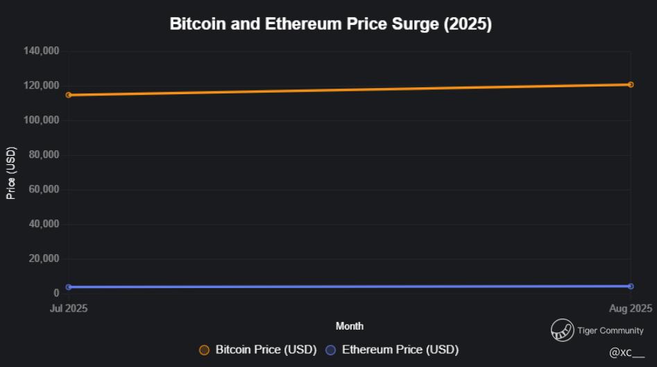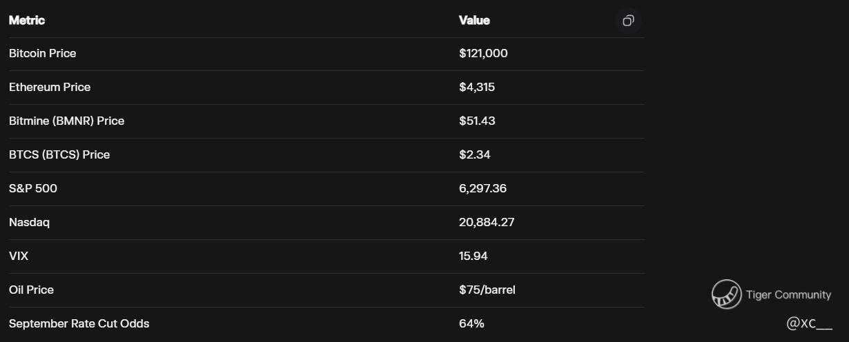 Bitcoin Breakout: Bitcoin’s $121,000 milestone, up 5% weekly, follows a 10% rally since July, driven by Trump’s pro-crypto stance and a 64% September rate cut probability, per CME FedWatch.
