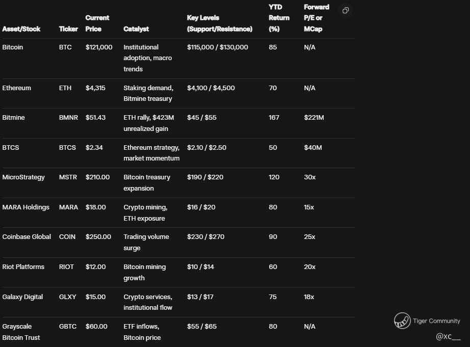Bitcoin (BTC): Up 85% YTD, targeting $130,000, support at $115,000.