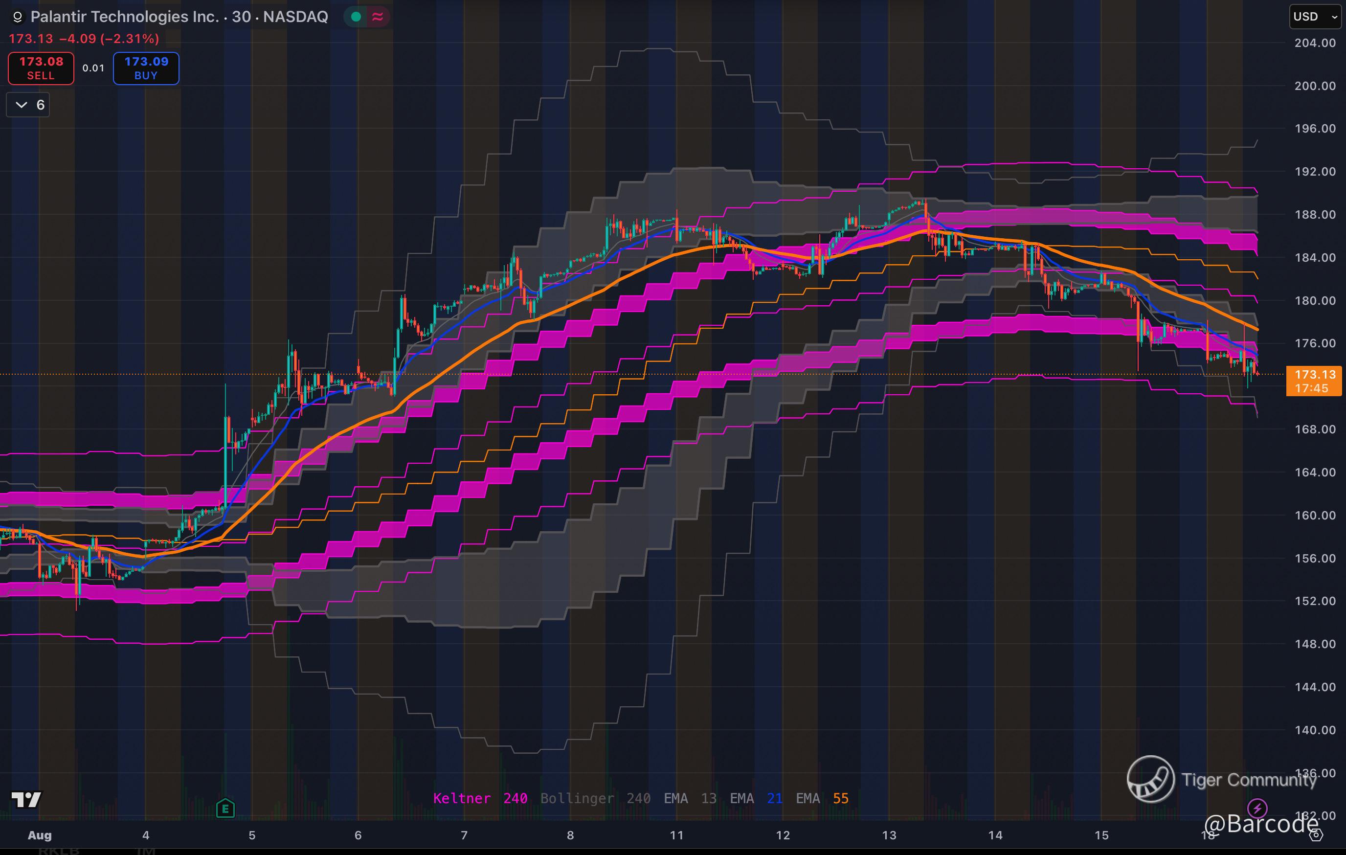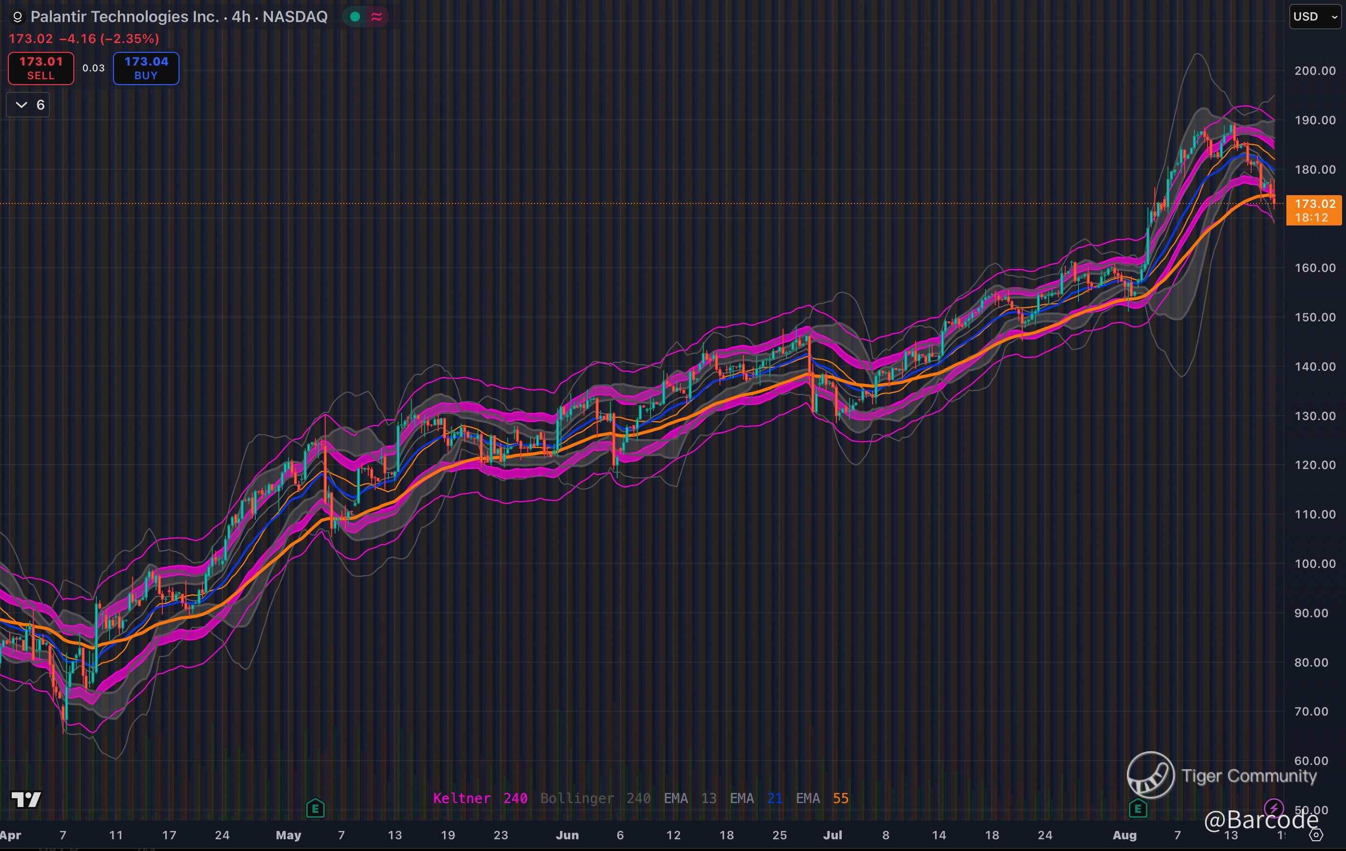 The 4H chart remains contained within rising Keltner and Bollinger channels with EMAs aligned; that structure has absorbed every retrace since May. The 30m rhythm shows controlled pullbacks that respect the lower bands. Structure first; headlines second.