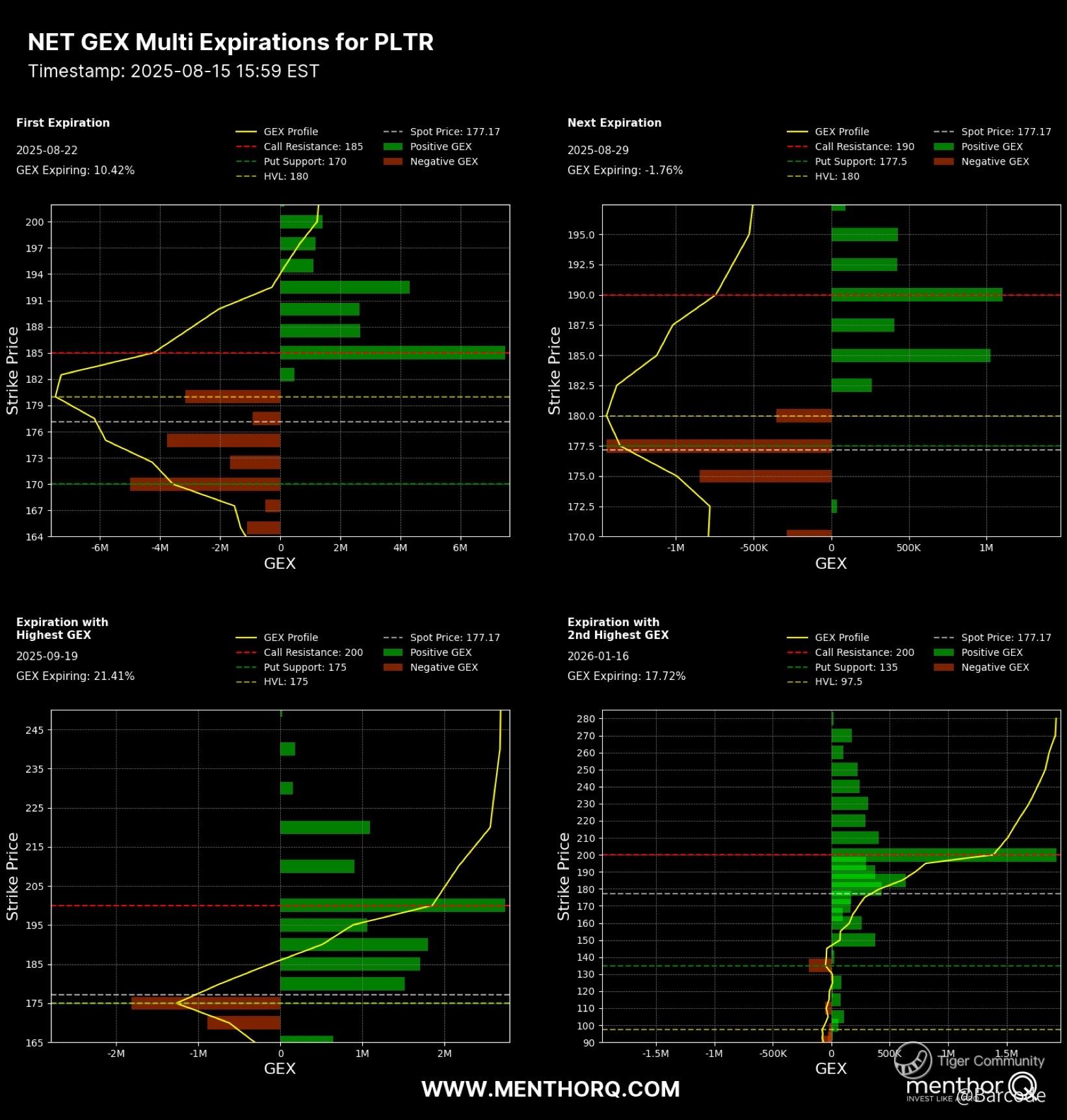 Price recently printed a record $190 and shares are up 134% year to date. Now near $177.2, the options map shows put support clustered at $170 and call walls at $185 and $190. September and January carry the heaviest GEX loads. Momentum with flows sets the zones to watch.