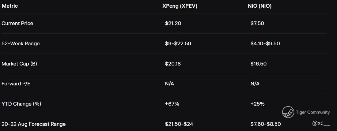 Daily Forecast: XPeng $21.50-$23 (20th), $21-$22.50 (21st), $22-$24 (22nd); NIO $7.60-$8.20 (20th), $7.50-$8 (21st), $7.70-$8.50 (22nd), per analyst trends.