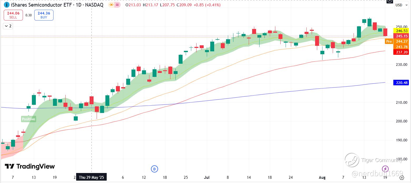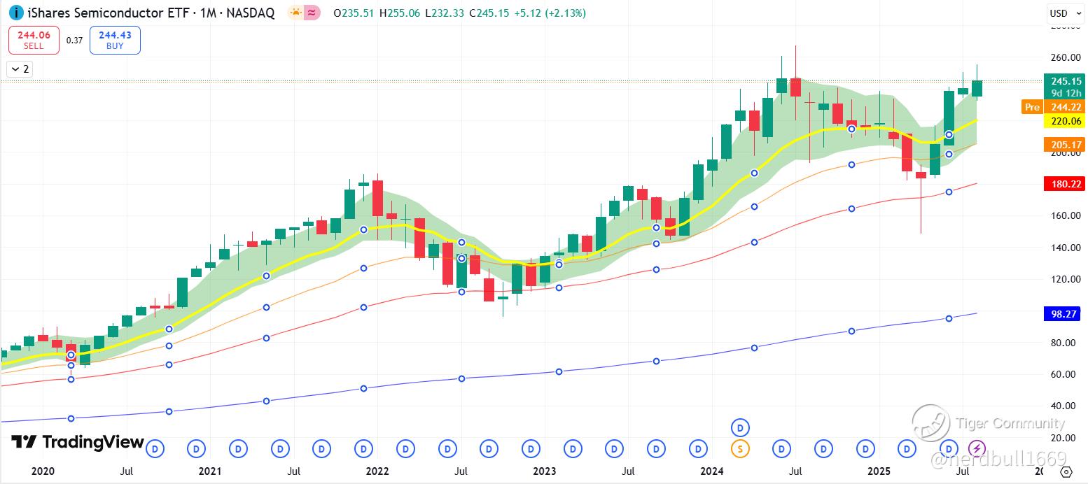 If we looked at the $iShares Semiconductor ETF(SOXX)$ daily chart, it is near the 12-EMA level, though the bulls are in control, they might have some hard time trying to defend this level. The pullback is more obvious when we looked at the monthly EMA.