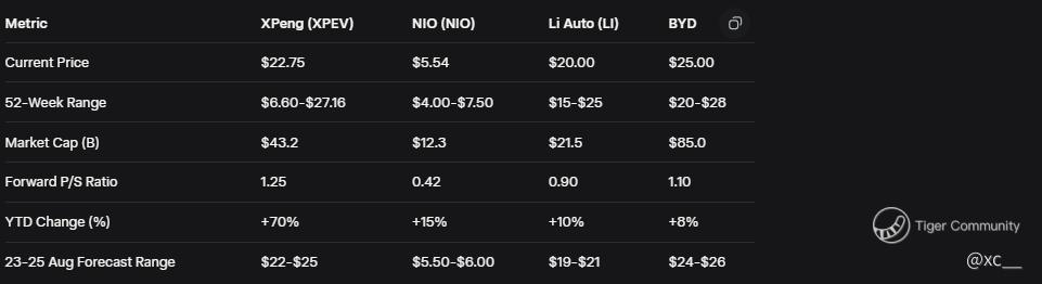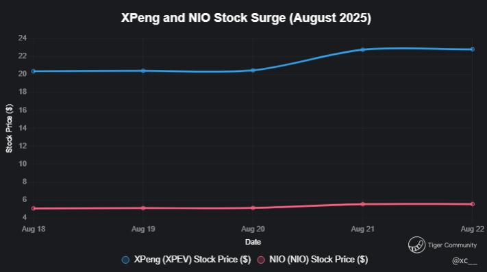 XPeng’s 11.68% leap to $22.75 and NIO’s 9.27% surge to $5.54 on August 22, 2025, outshine Li Auto’s flatline and BYD’s 1% gain, driven by China’s EV subsidy renewal. XPeng’s 70% year-to-date rise and NIO’s recovery from $5.00 signal a sector pivot, with Q2 deliveries of 103,181 and 61,855 units respectively. A 5-10% upside to $25 (XPeng) or $6.00 (NIO) is possible by month-end if subsidies hold, but a 10-15% drop to $19 (XPeng) or $4.80 (NIO) looms if unit economics falter or tariffs (30-35%) escalate. XPeng’s tech edge and NIO’s value play offer contrasting bets—pick wisely based on your risk appetite. Share your EV strategy below!