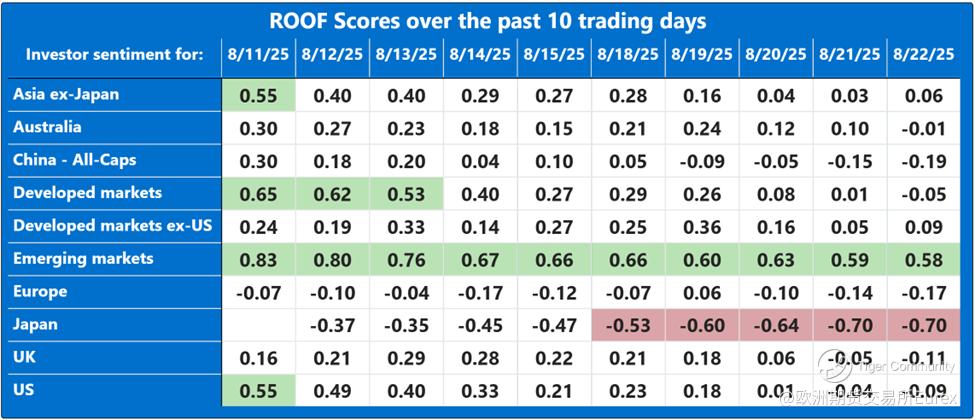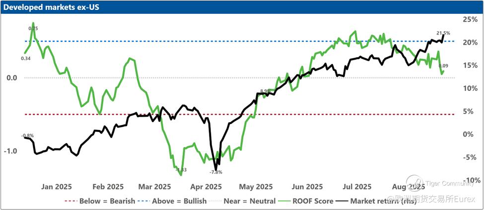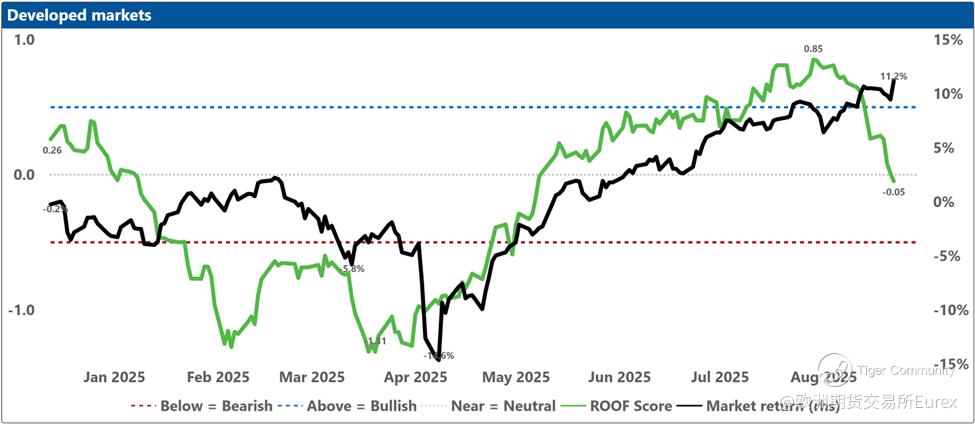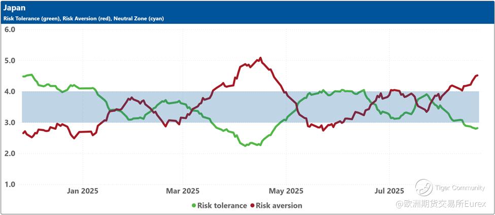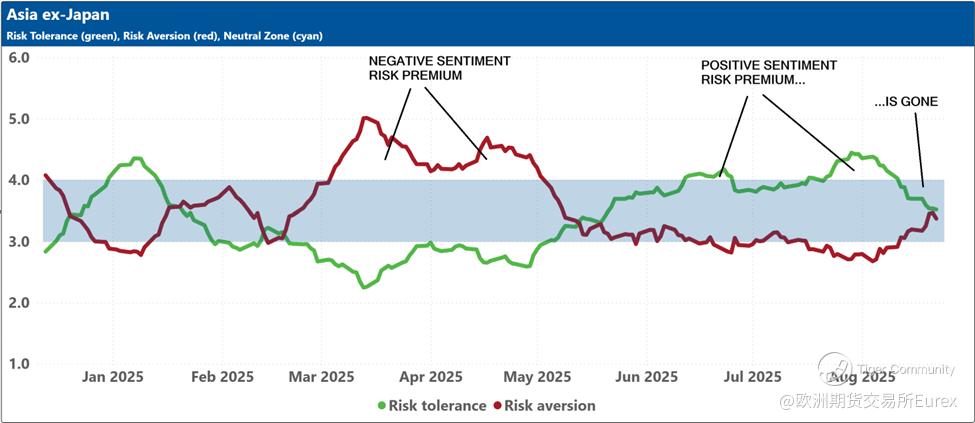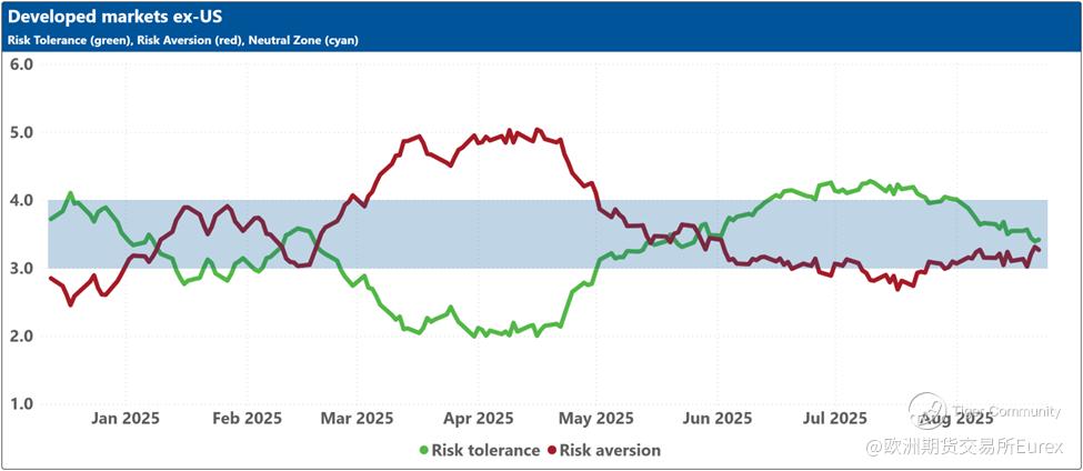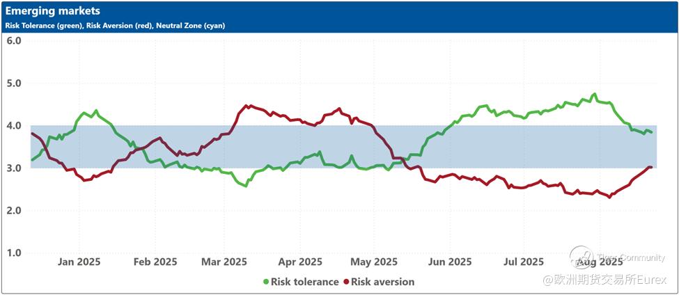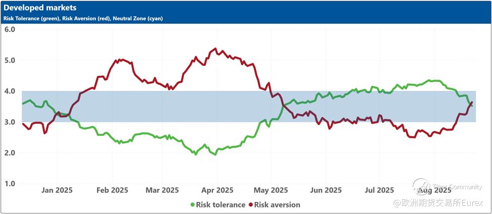 Over the past two weeks, investor sentiment has dropped sharply across almost every market we track, with only Global Emerging Markets managing to maintain a positive sentiment risk premium. Ongoing uncertainties—such as stalled peace talks in Ukraine, escalating tensions in the US-China chip dispute, and mounting concerns about the independence of the Federal Reserve—have made investors increasingly wary. Despite this, Powell’s uncharacteristically direct remarks on Friday regarding the likely outcome of the upcoming FOMC meeting sparked a widespread rally in US markets, driving them to record highs. Unless the upcoming PCE data delivers a negative surprise, the recent optimism about potential rate cuts could fuel a rebound in sentiment this week.