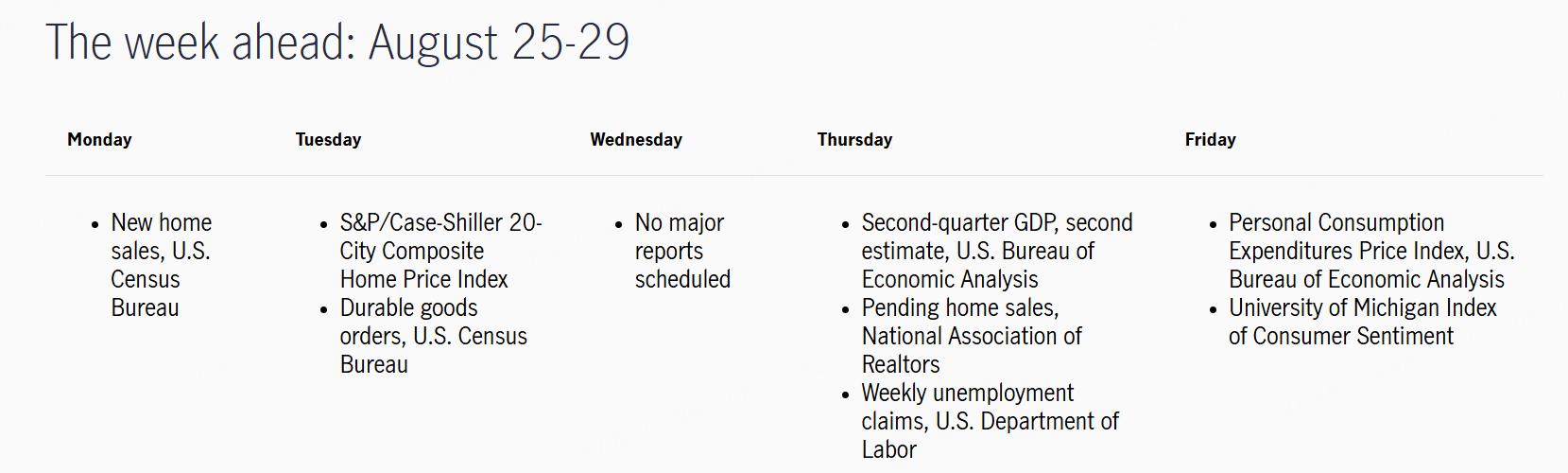 The S&P 500 finished slightly higher last week, recovering on Friday after four days of losses, lifted by Fed Chair Jerome Powell’s Jackson Hole comments hinting at possible rate cuts. Value stocks outperformed growth, with energy, real estate, financials, and materials leading gains. Mid- and small-cap indexes rallied strongly, while the Nasdaq fell on profit-taking and concerns over the sustainability of AI-driven investment. Treasuries also advanced after Powell’s remarks, pushing yields lower.