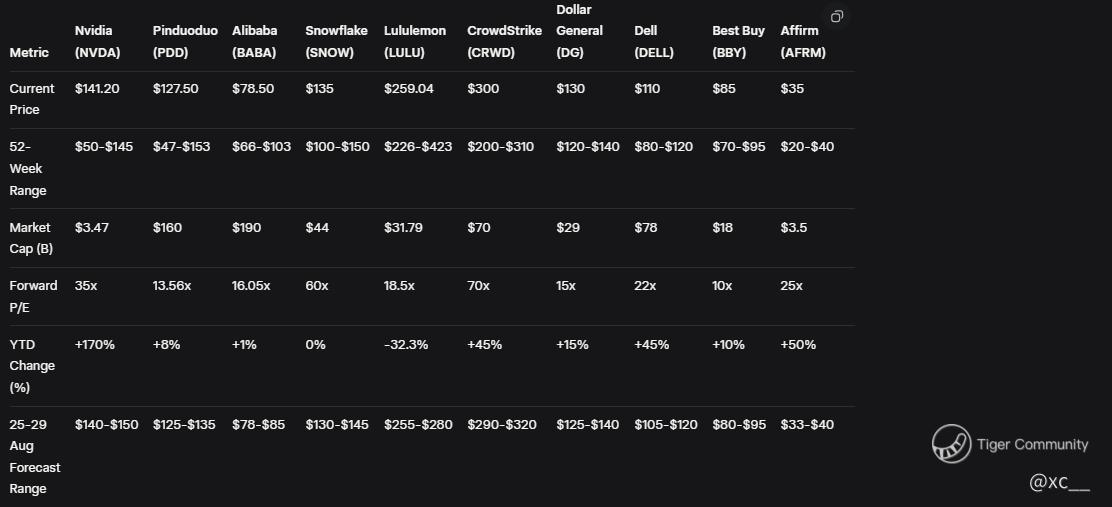 Nvidia ( $NVIDIA(NVDA)$ ): At $141.20, up 28% YTD, Q2 earnings on Wednesday could push it to $150-$155 (6-10% gain) if Blackwell guidance shines, or $130-$135 (7-9% drop) if delays disappoint. Support at $135, resistance at $145.