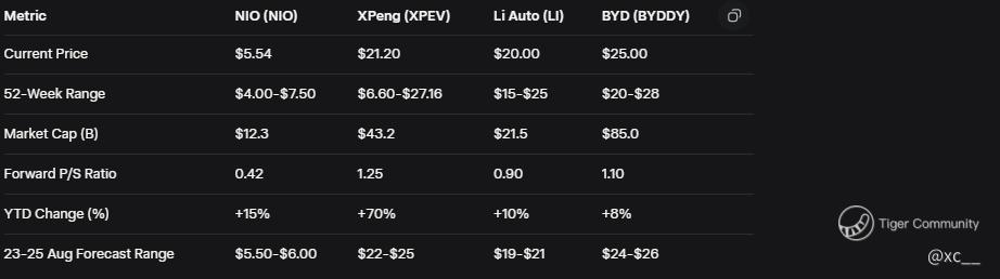 NIO’s 9.27% surge to $5.54 and XPeng’s 11.68% leap to $21.20 on August 22, 2025, outshine Li Auto and BYD's gains, driven by China's EV subsidy extension. NIO’s ES8 relaunch and XPeng’s G7 AI tech fuel optimism, with Q3 deliveries of 61,855 (NIO) and 103,181 (XPeng). A 8-12% rise to $6 (NIO) or $23.50 (XPeng) is possible this week if $5.50-$21 supports hold, with long-term targets of $8-$9 (NIO) and $30-$35 (XPeng) by 2026 if growth persists. A 5-10% dip to $5.00 (NIO) or $19 (XPeng) threatens if subsidies wane or tariffs intensify. NIO’s value and XPeng’s transformation offer contrasting bets—choose wisely based on your risk tolerance. Share your EV strategy below!