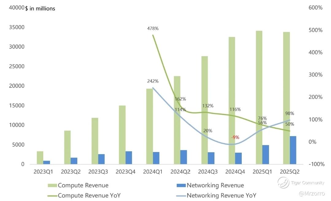 ~AI Compute: $33.8B, +50% YoY, –1% QoQ, mainly reflecting the H20 halt and the Hopper→Blackwell transition; Blackwell products rose +17% QoQ in Q2.