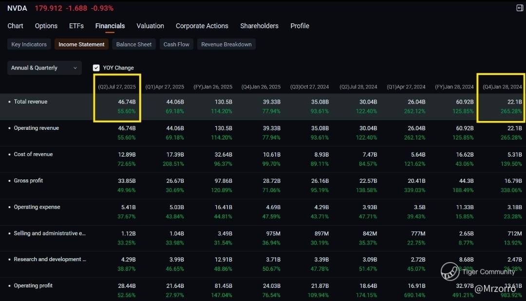 Total revenue growth slowed to 56% to $46.74 billion. That’s the smallest gain in percentage terms since the three months ended April 2023, when sales slipped 13.2%. Although growth has slowed from a peak of 265% in January 2024, the latest figure is still more than double the $22.1 billion recorded when Nvidia was growing at that blistering speed.