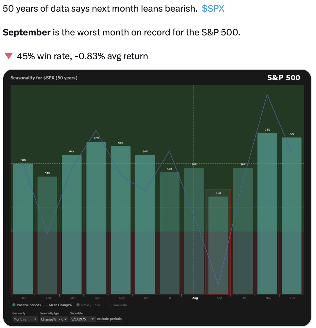 For September, I see the “September Effect” less as superstition and more as seasonal rebalancing—funds trimming and investors locking profits. Volatility usually rises, so I’ll be careful with short-term trades but stay steady with long-term positions. It’s a month where discipline matters more than prediction.
