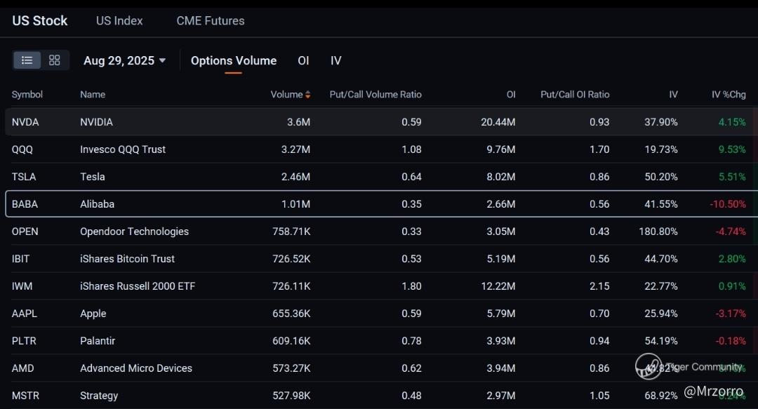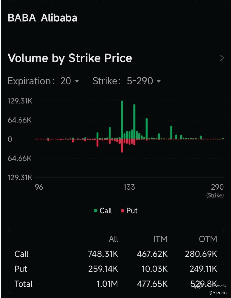 Including put options, volume reached 1.01 million Alibaba contracts so far. That puts the e-commerce behind $Tesla (TSLA.US)$'s 2.46 million options and $NVIDIA (NVDA.US)$'s 3.6 million.