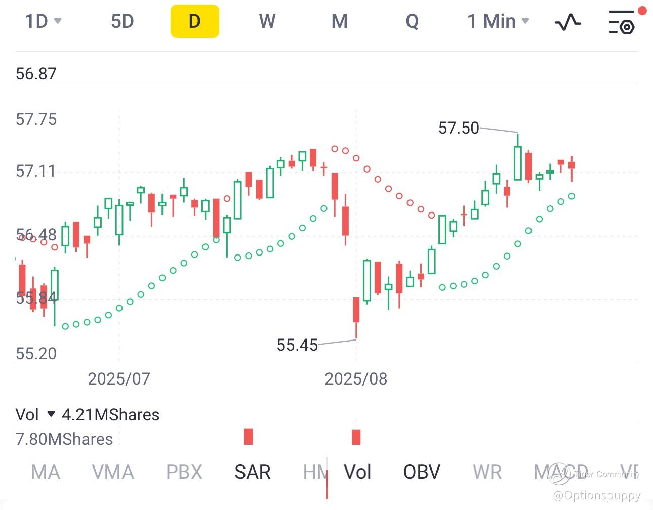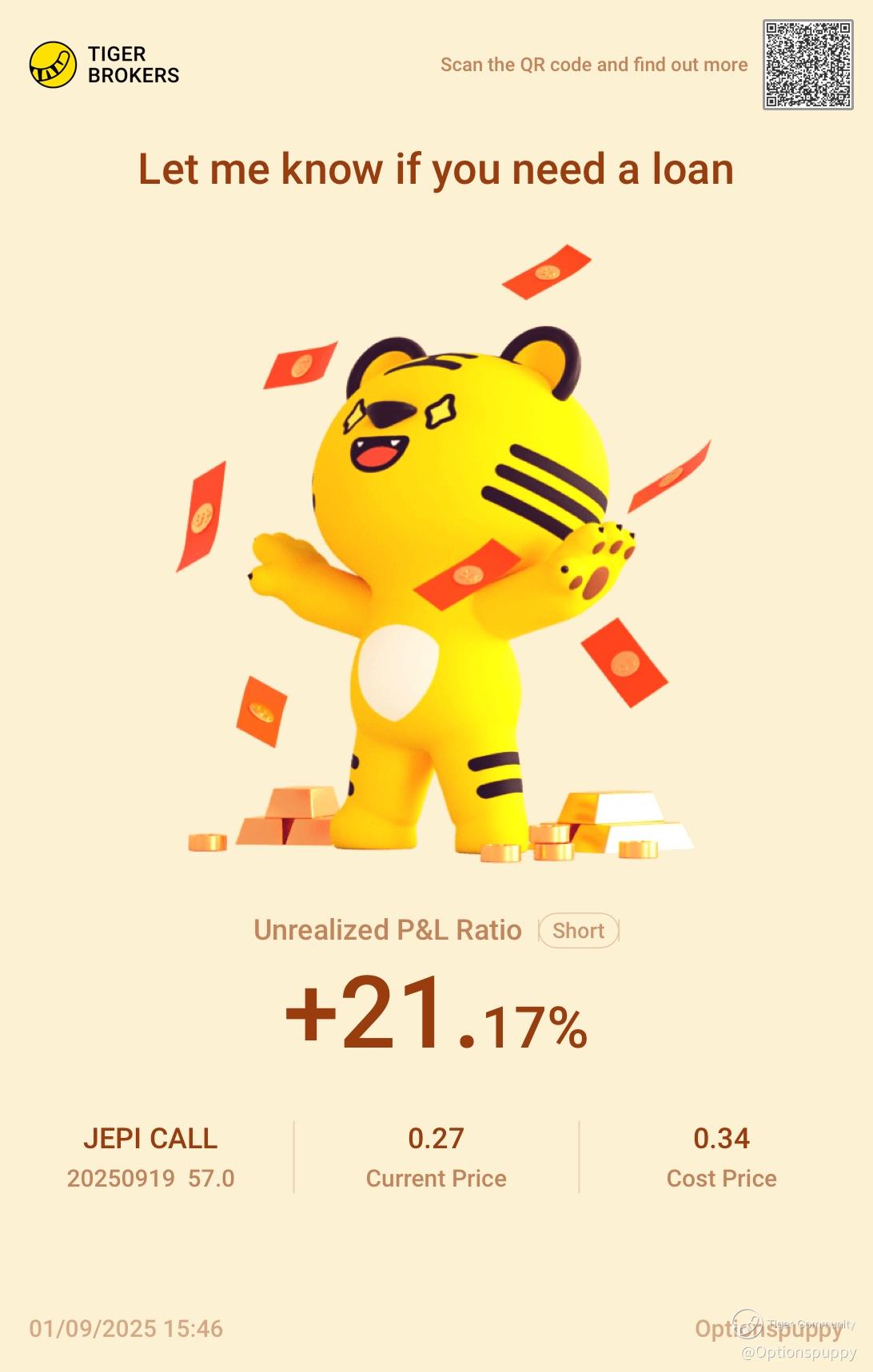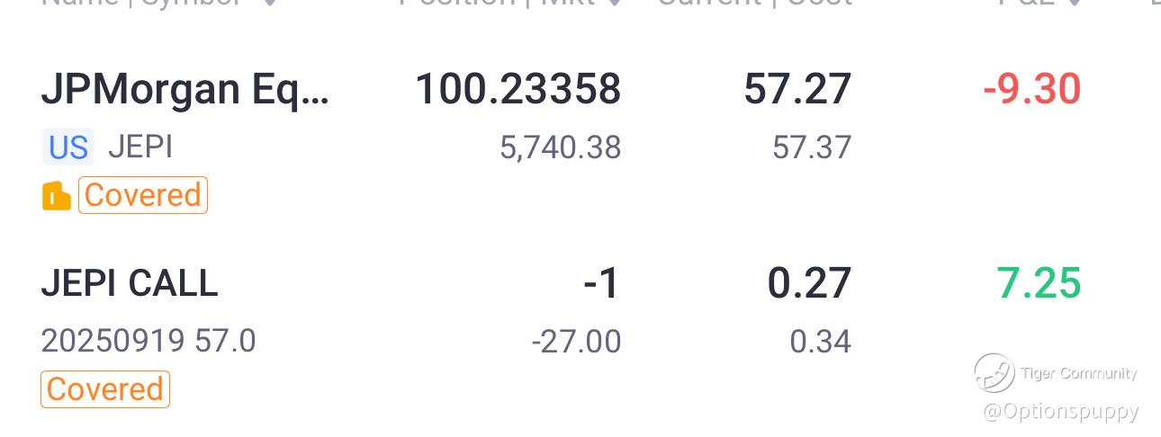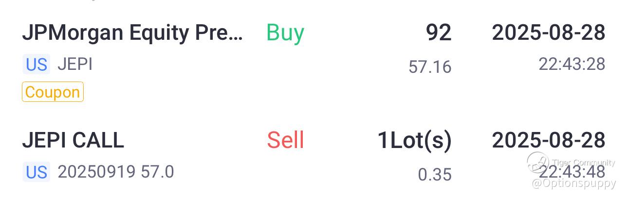 Subscribe to me.Post a comment in the comment section—if noticed by the official team, you’ll have a chance to receive 50 Tiger Coins as a reward!As part of my Options Puppy journey, I’m always sniffing around for trades that can generate steady little snacks of income. Last Friday, I spotted an opportunity with JEPI (JPMorgan Equity Premium Income ETF). I picked up 100 shares at $57.16, then immediately wagged my tail and sold a covered call at the $57 strike for $0.34 per share.