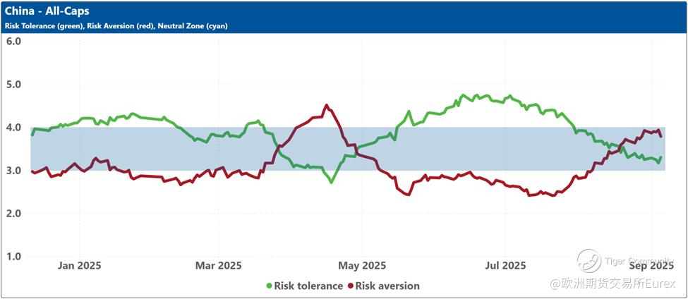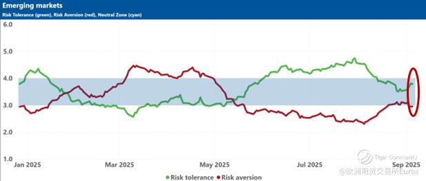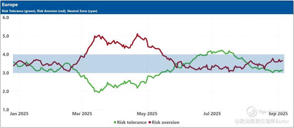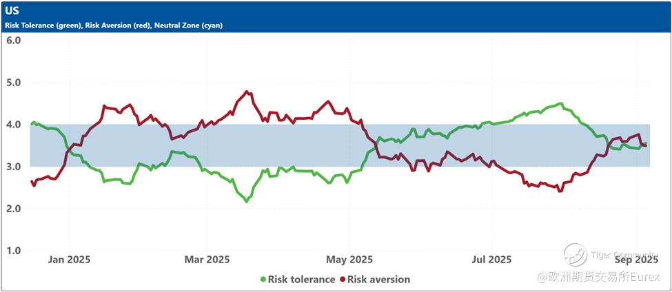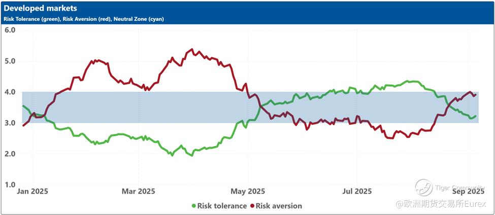 The bottom charts display the levels of risk tolerance (green line) and risk aversion (red line) within the market, representing investors' demand and supply for risk, respectively. Key insights include: