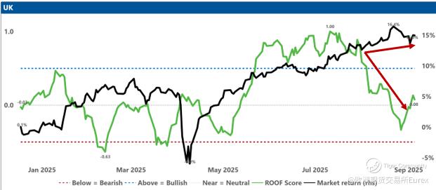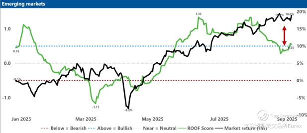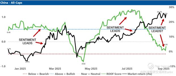 The top charts illustrate the ROOF ratio, which represents investor sentiment. This ratio is depicted in green on the left axis, while the cumulative returns of the underlying market are shown in black on the right axis. Key reference lines include: