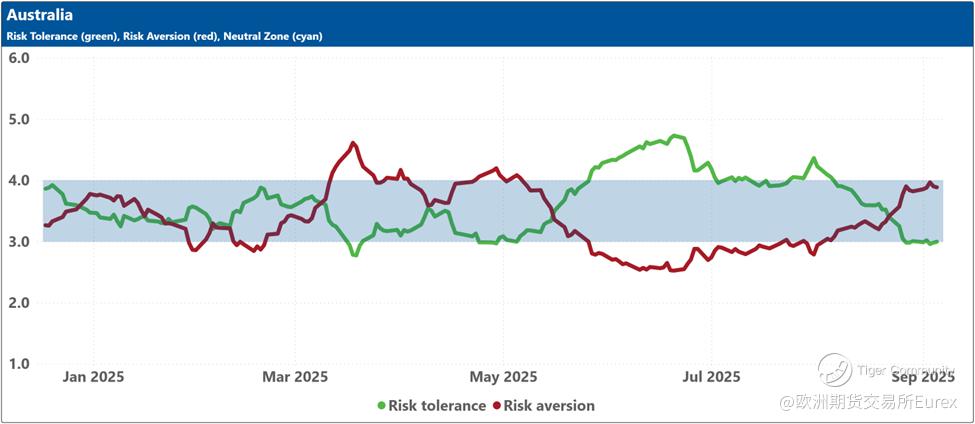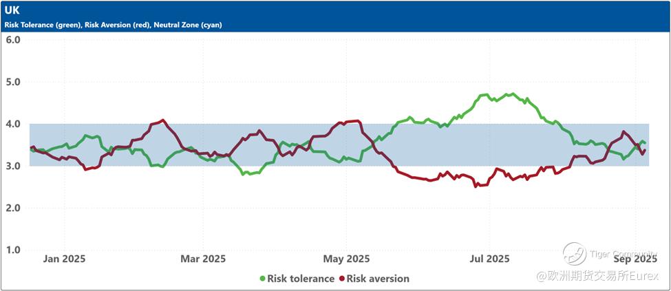 The blue shaded zone between levels 3 and 4 for both indicators signifies a reasonable balance between the supply and demand for risk in the market. When both lines remain within this blue zone, the market is considered ‘emotionally’ stable. However, when both lines move outside this zone, the significant imbalance in demand and supply for risk can lead to overreactions to unexpected news or risk events.