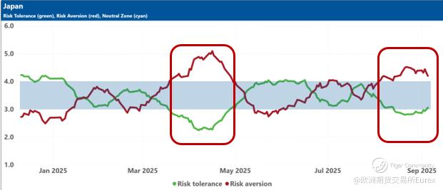 Conversely, when risk aversion (red line) surpasses risk tolerance (green line), the market dynamics reverse.