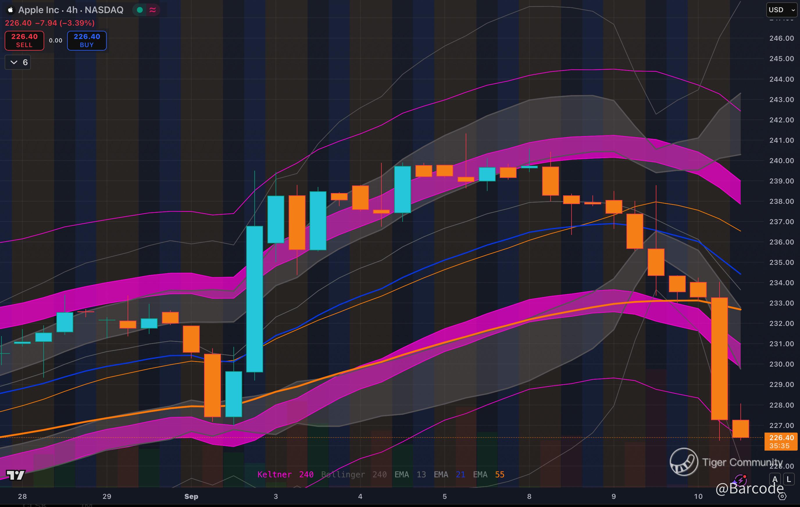 Iβm watching the 4H where price flushed the Keltner mid and rides the lower Bollinger. EMAs 13 and 21 rolled; 55 is bending. $225.50 is my demand shelf; lose it and $222 is the next liquidity magnet. Hold it and I target a reflex back to 231 to 233 where the 21 EMA and Boll mid converge. Iβm framing this as a sweep and retest setup. Momentum is heavy; confirmation matters.