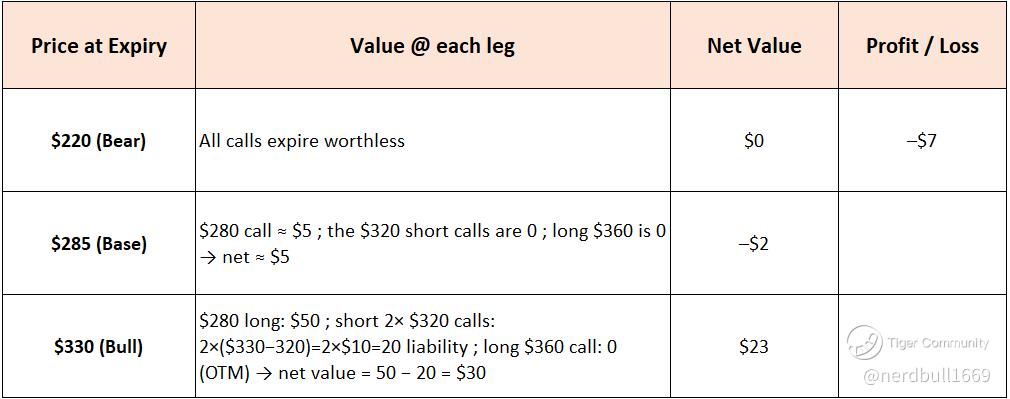 Breakevens: Lower BE ≈ strike of long lower call + net cost = ~ $280 + $7 = $287. Upper BE ≈ strike of long upper call − net cost = $360 − $7 = $353 (but in practice profit declines above $320).