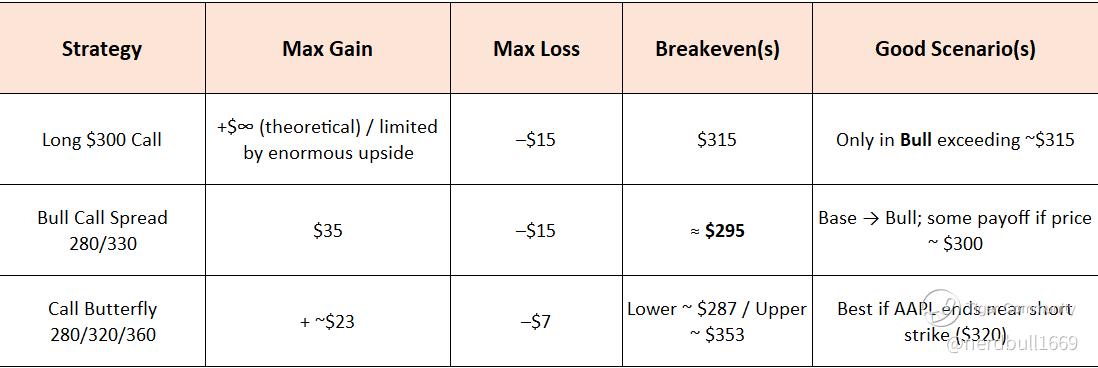 In the next section, I would like to share some example option-strategies (structures) for Apple stock (AAPL, current price ≈ $256) and P&L under three scenarios by end-of-2025: Bear, Base, Bull.
