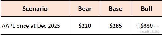 Bull (30% chance): iPhone 17 continues +10–15% share/units vs prior cycle + services upside + guidance bumped → multiple expands → >$300 (target zone $300–$340).
