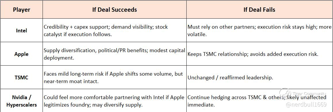 Failure keeps the status quo (TSMC remains Apple’s main foundry), leaves Intel to prove itself with other partners, and maintains higher execution risk and stock volatility for Intel.