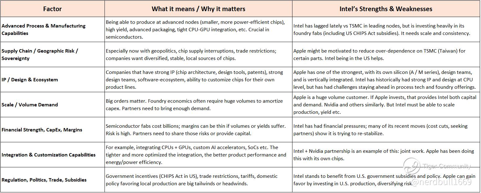 Here are the main factors and sources of competitive advantage (“moats”) that matter. This would be useful if we are evaluating this kind of partnership (Intel + Apple, or similar).