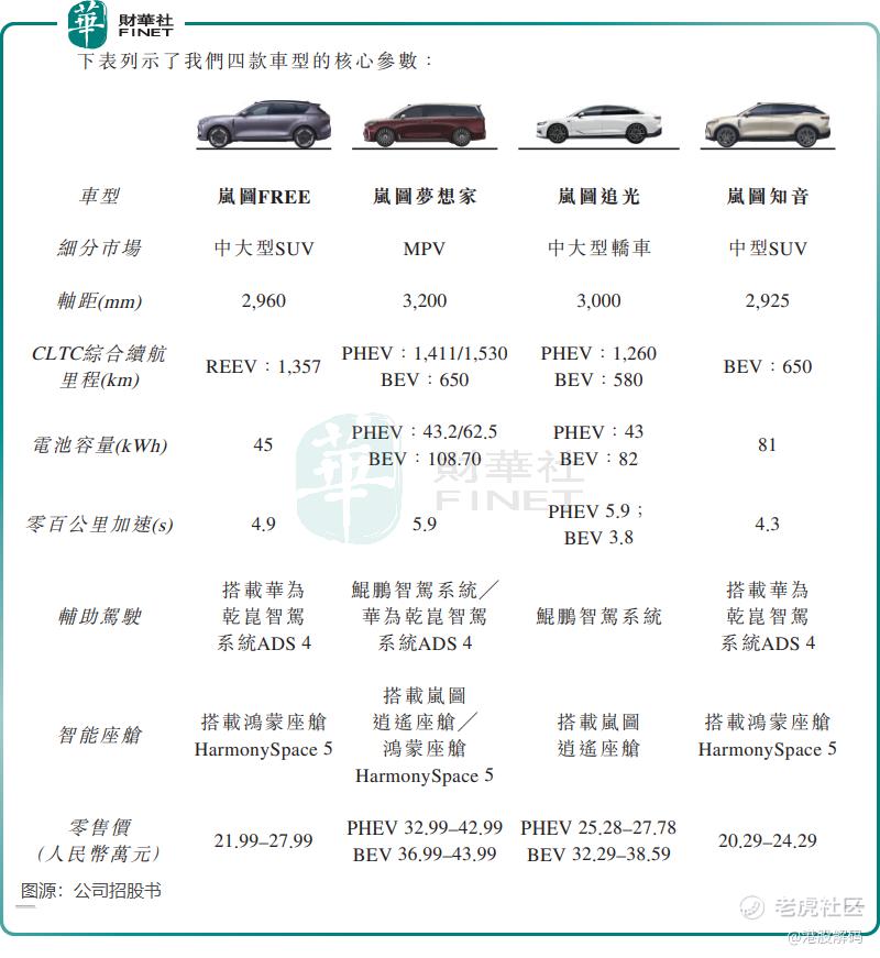 於2021年6月,嵐圖汽車推出嵐圖FREE車型,隨後分別於2022年5月、2023年4月及2024年10月推出嵐圖夢想家、嵐圖追光及嵐圖知音。公司產品目標人羣定位於新時代中堅力量,產品主要覆蓋20萬元(單位人民幣,下同)至50萬元價格帶。