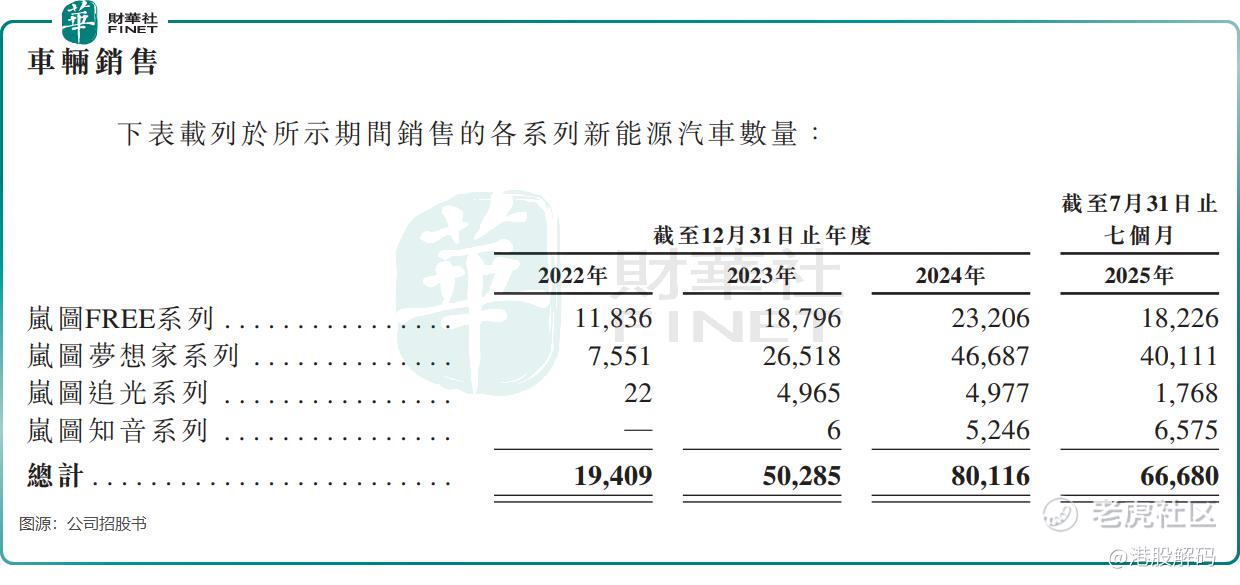 於2022年、2023年、2024年及2025年前7個月,嵐圖汽車分別實現銷售約1.9萬輛、5萬輛、8萬輛及6.7萬輛汽車,2022-2024年銷量複合年增長率爲103.2%,爲增速第3快的中國高端新能源汽車品牌。
