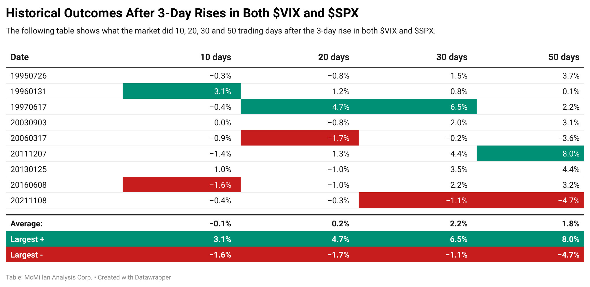 So, we looked at cases where both $VIX and $SPX had been up for three days together. There are nine of those, not including the most recent one. Even a sample size of nine is questionable, but if a distinct pattern emerged it might be worth considering. The following table shows what the market did 10, 20, 30 and 50 trading days after the 3-day rise in both $VIX and $SPX...