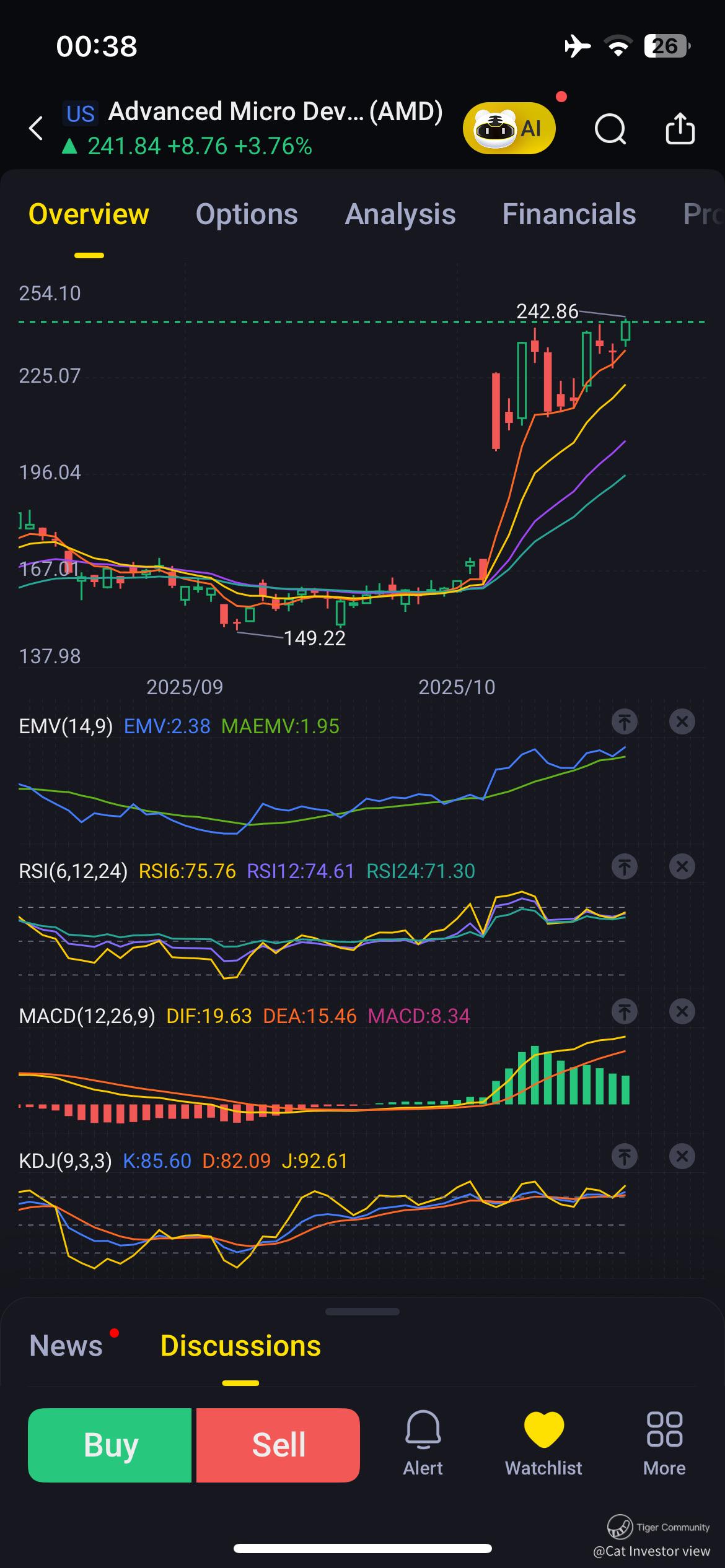 AMD has been on a strong run lately, with its daily chart showing a clear bullish structure. The stock is trading well above the 20-, 50-, and 200-day EMAs, signaling alignment across short-, mid-, and long-term trends — the bulls remain firmly in control.