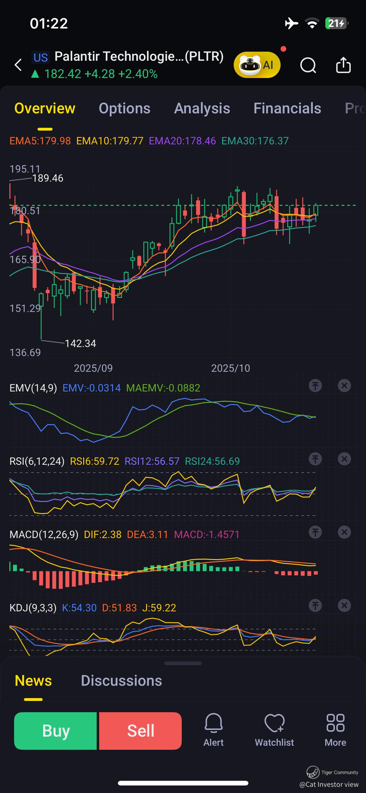 $Palantir Technologies Inc.(PLTR)$ The stock has been consolidating between $170–190 after a strong rally. Price is holding above the 20 & 50-day EMAs, but momentum has flattened. A breakout above $190 on volume could trigger a move toward $205–210. A drop below the 50-day EMA risks a deeper pullback