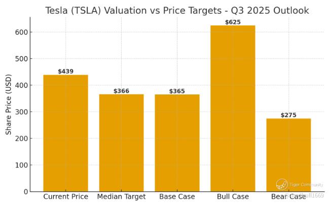 Below is a visualization comparing Tesla’s (TSLA) current share price versus analyst and scenario-based price targets. It highlights that while the current price (~$439) exceeds most median targets (~$365), the bull case scenario offers potential upside toward $600+, while the bear case suggests downside to around $275 if margins or demand weaken.