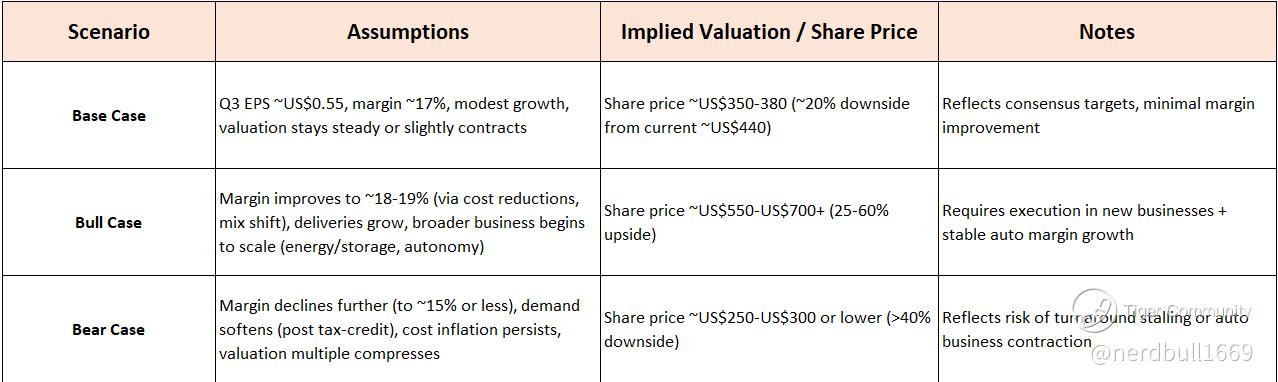 If Tesla reports Q3 margin at or above ~17% and offers positive forward commentary (especially on cost reductions, mix, energy/storage), share price may push toward the bull case zone (~US$550-700).